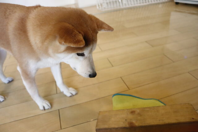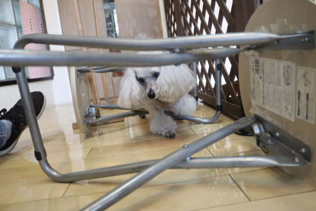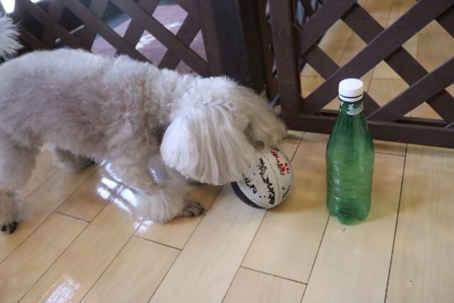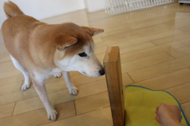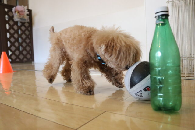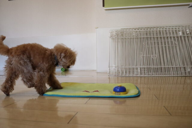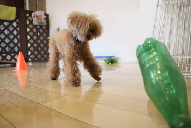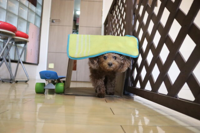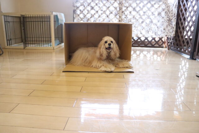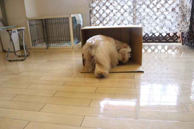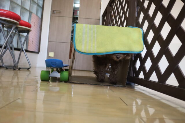 かくれんぼの練習では「隠れて!」の合図に合わせダンボールの中にスッポリと入るベルちゃんです♪