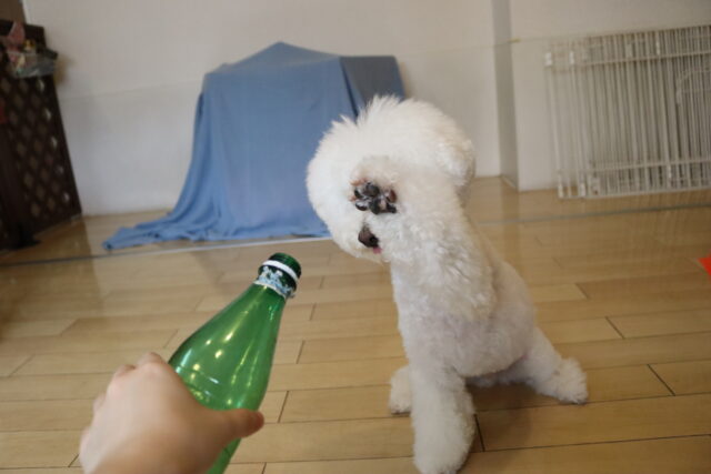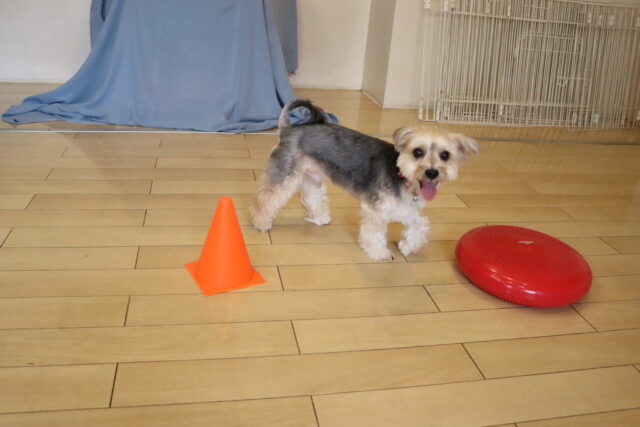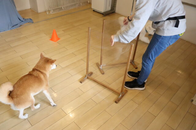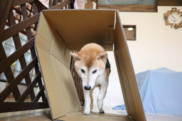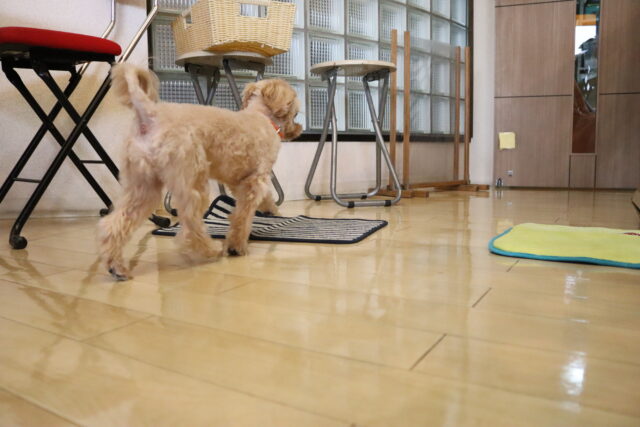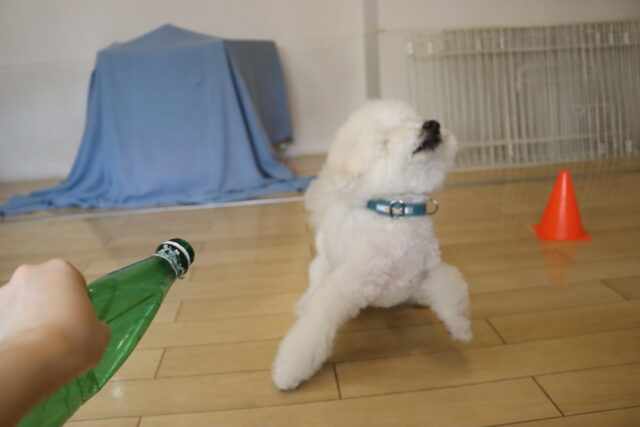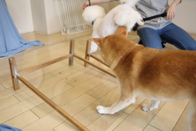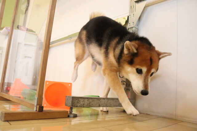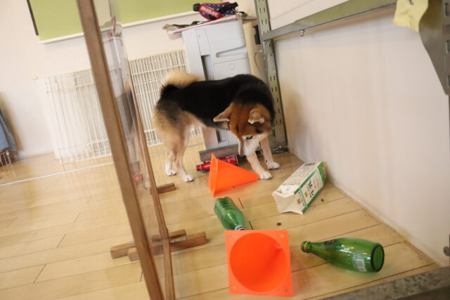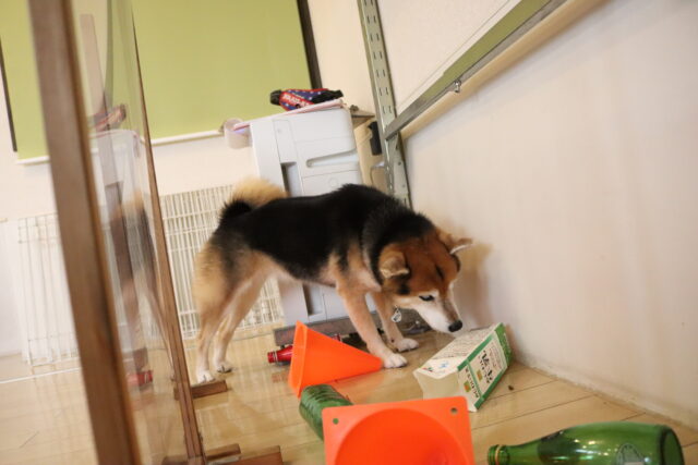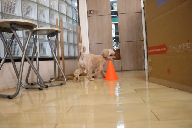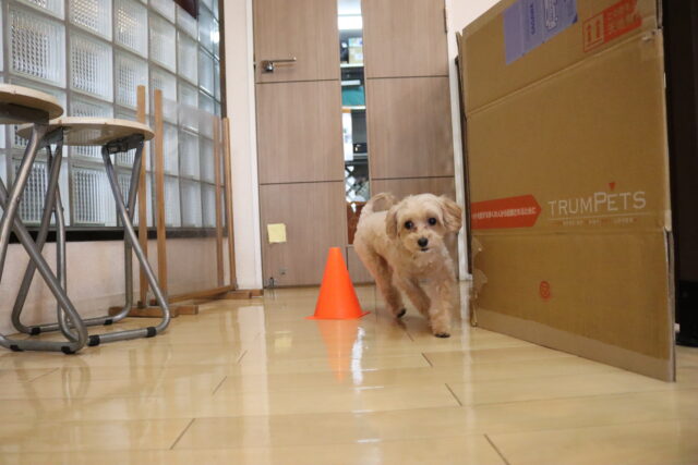 甜ちゃんは牛乳パックやビンなどが置いてあるところを通って物・足場慣れに挑戦!