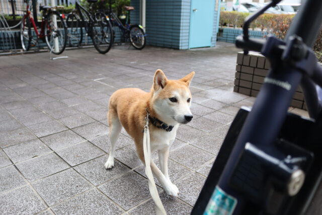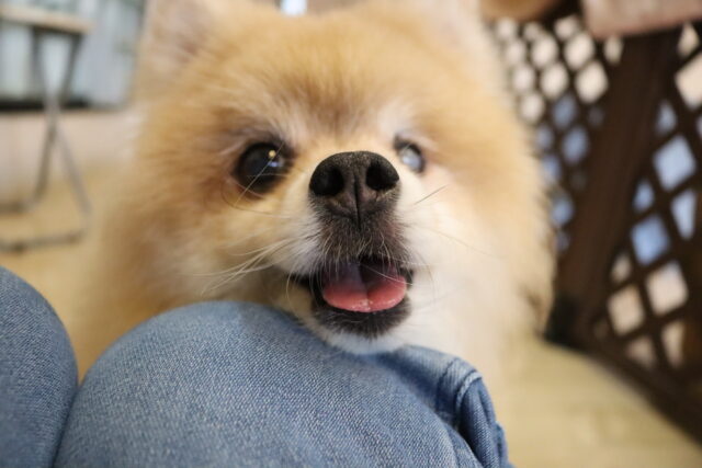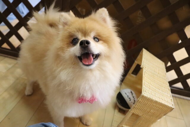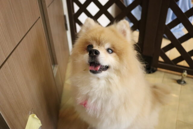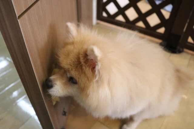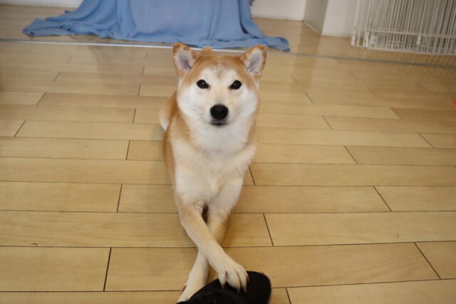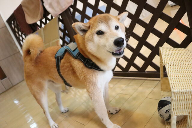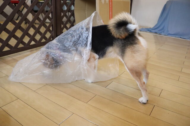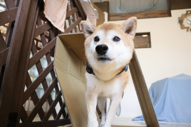 子ども用イスのカバーを動かすと驚いて尻尾が下がってしまった小春ちゃん💦