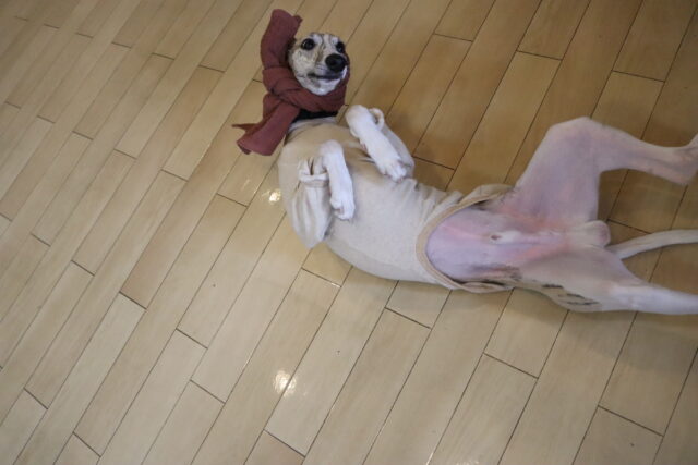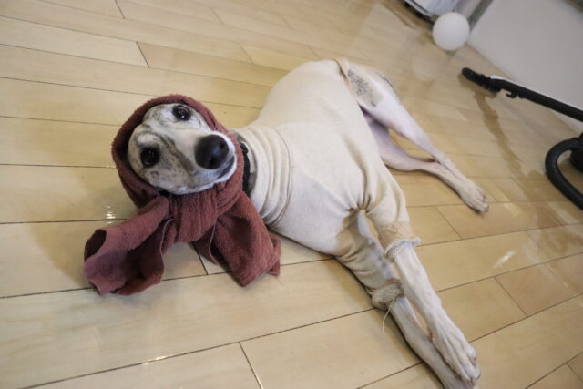 顔に巻くと気にしていましたが、スヌードのように巻き付けてゴローンとトリックを披露🎵