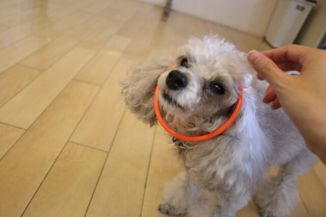 輪っかを顏に掛けようとすると少し警戒しつつも…