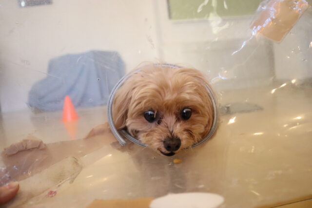 エリザベスカラー慣れでは始めは後ろに引くことがありつつも、大好きなフードをGETしようと積極的に取り組んでいましたよ♬