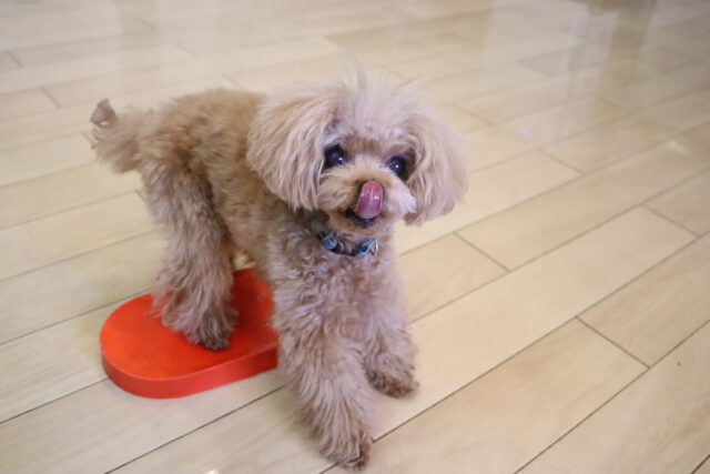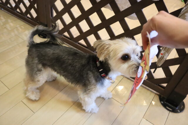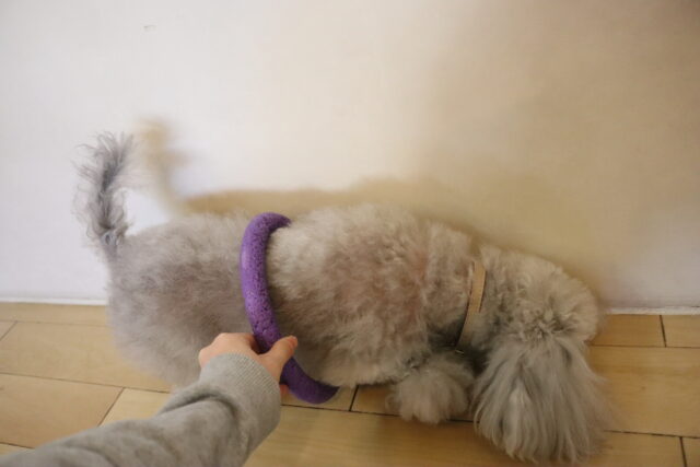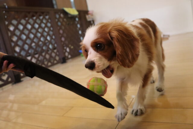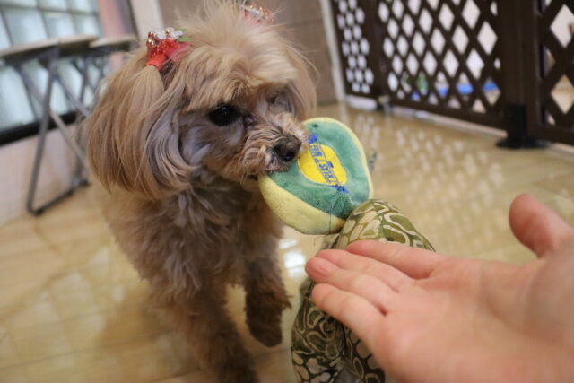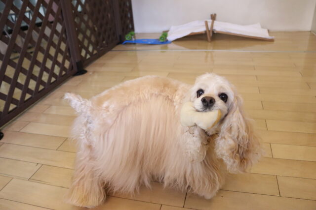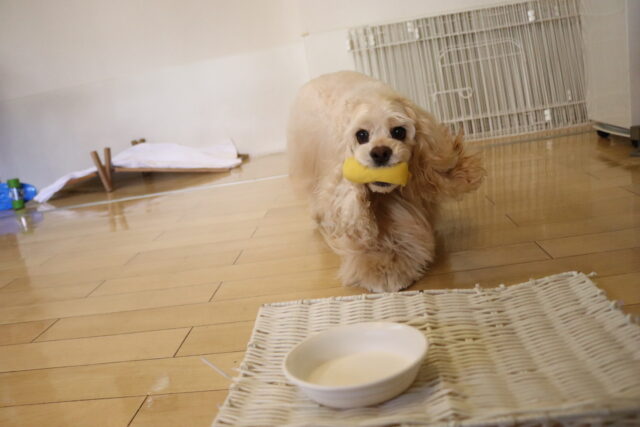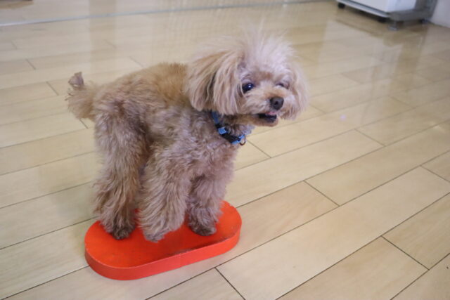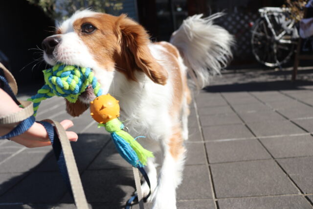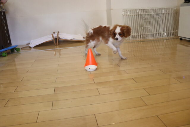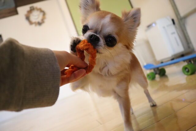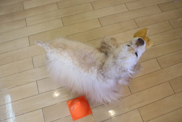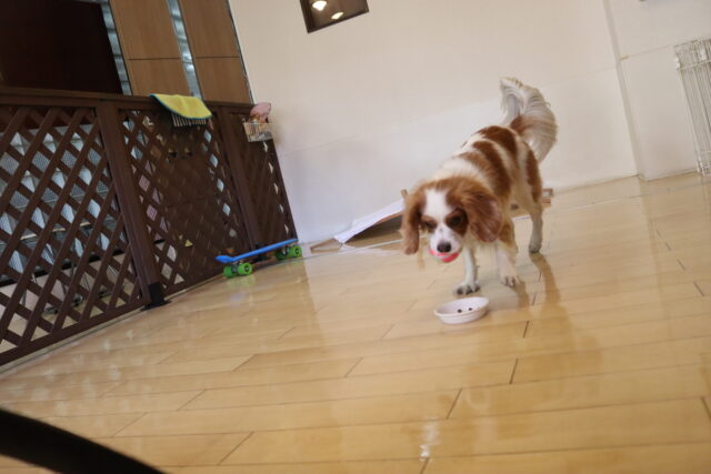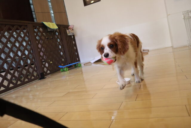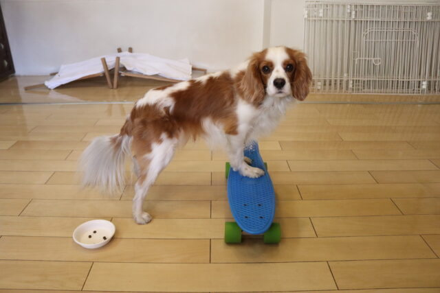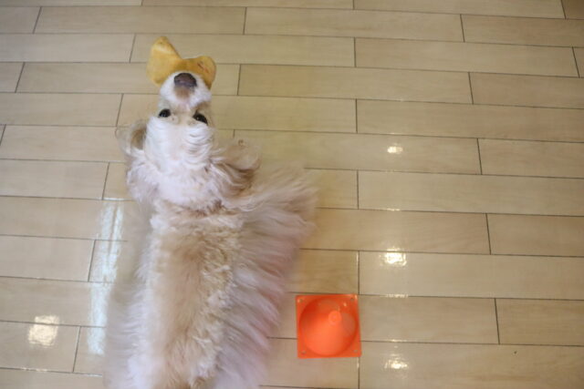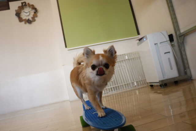 ベルちゃんはオモチャを咥えたままトリック練習!