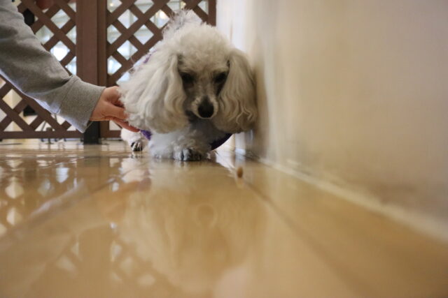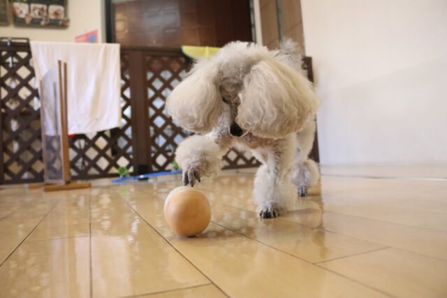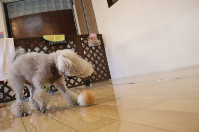 様々な方向に起き上がりこぼしが倒れるとビクビクと警戒をしていましたが、フードをGETするため真剣に行うシルヴィーちゃんでした😋