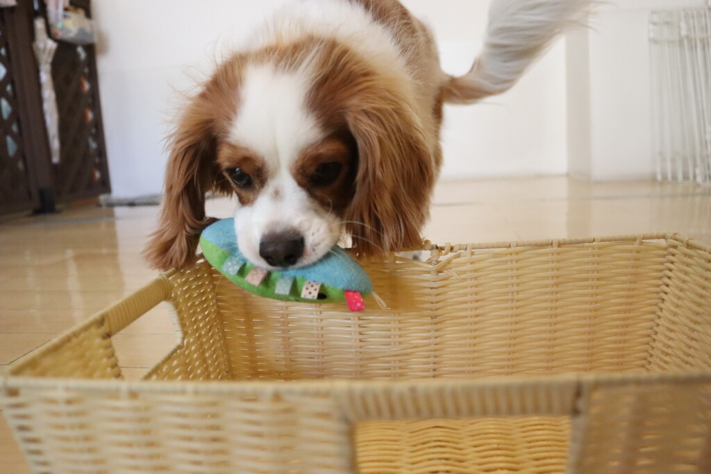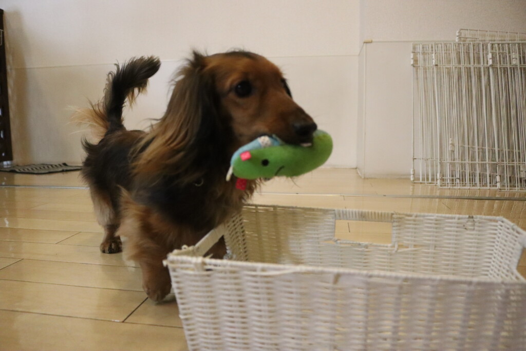 洗濯では苦手だった洗濯バサミの「パチン!」という音に慣れたようで豪快にオモチャを取りカゴの中へ!