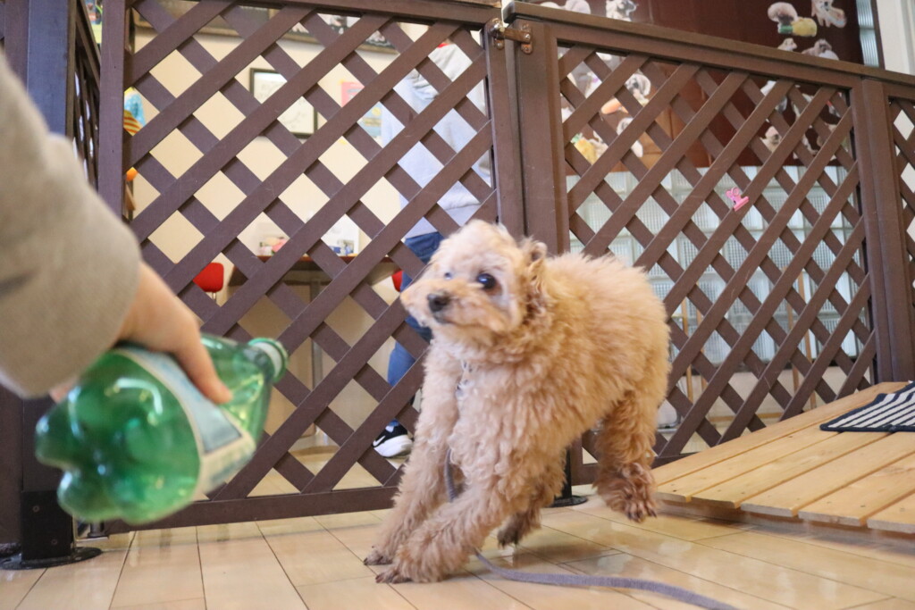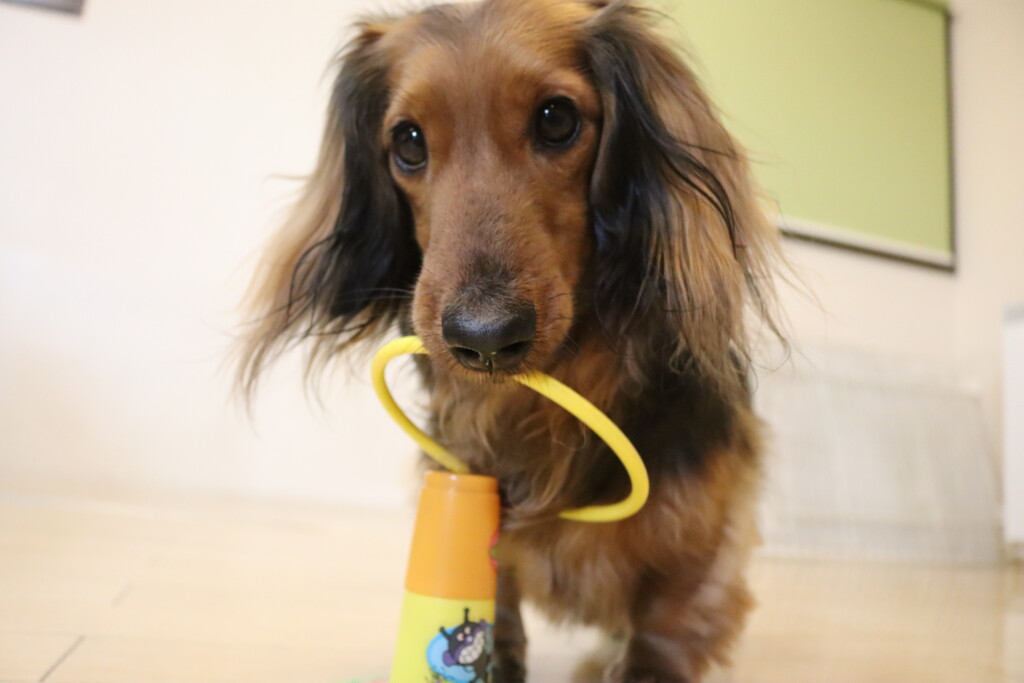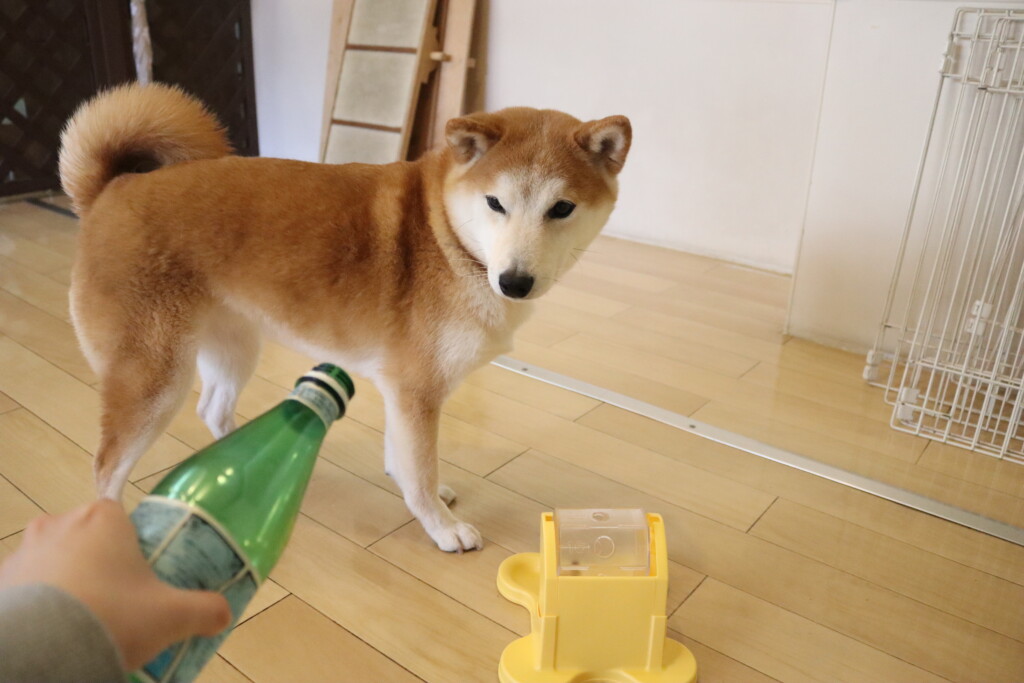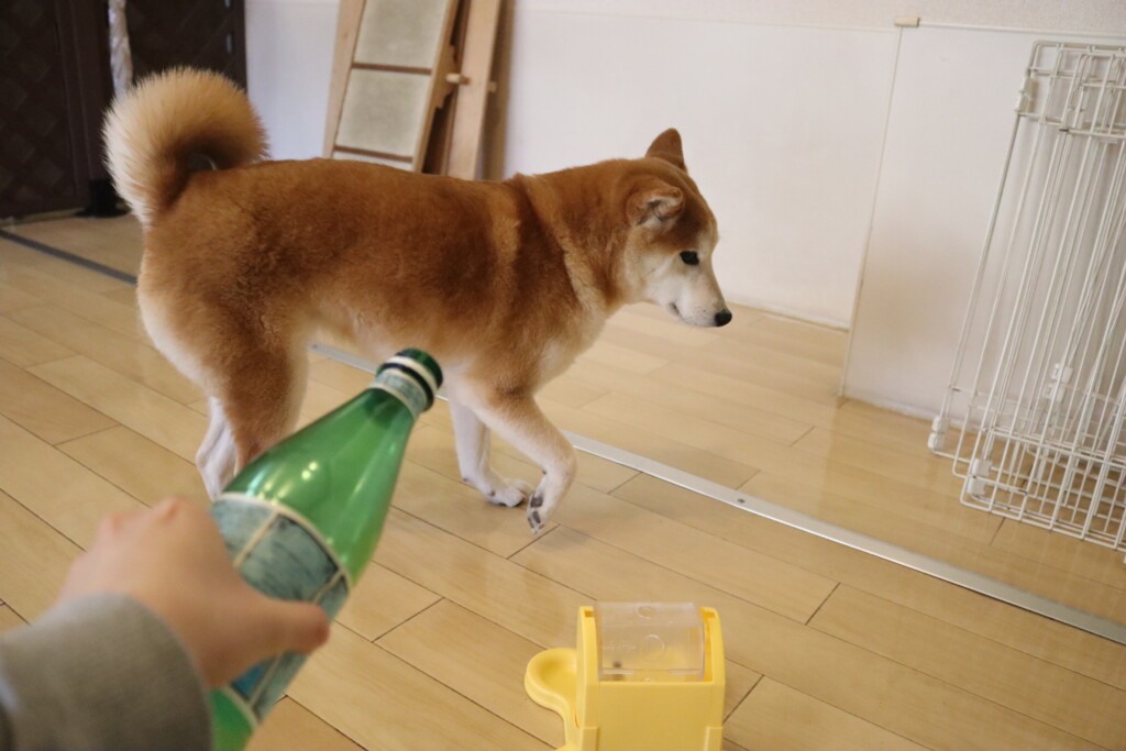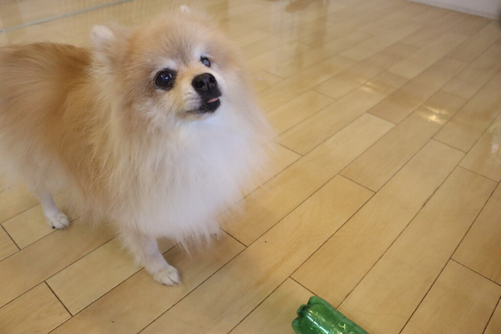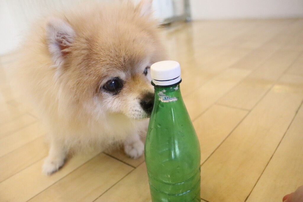 中に水を入れ重さがある状態でも「えいっ!」と力強くペットボトルを倒すパピーくんです✨