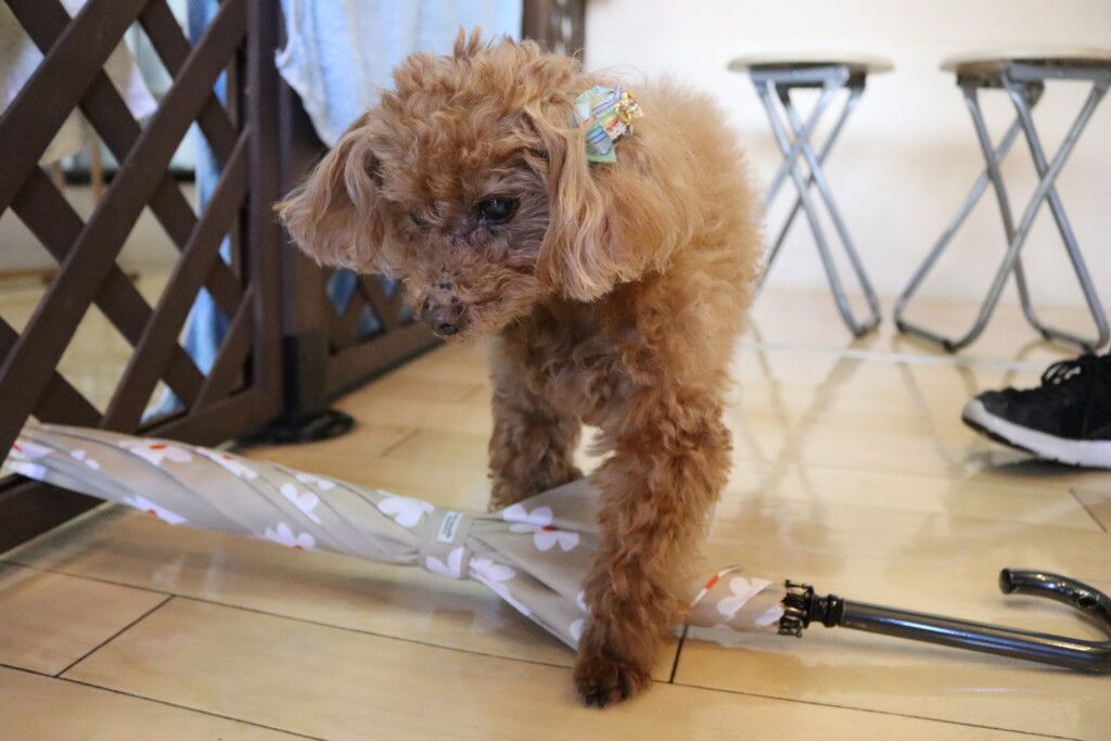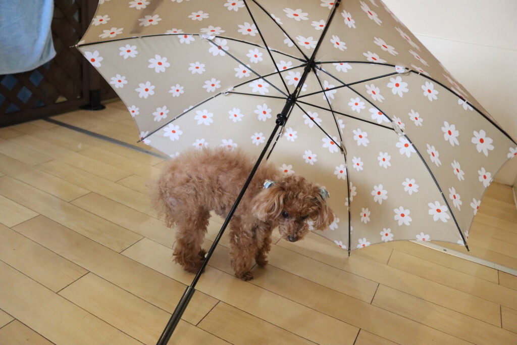 マロンくんは傘を使って物慣れしながら、