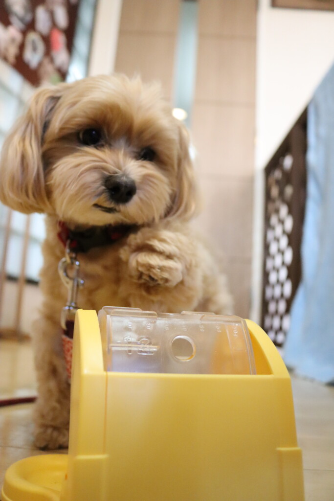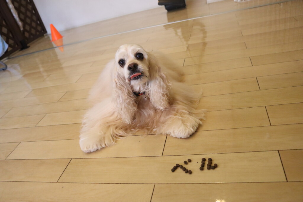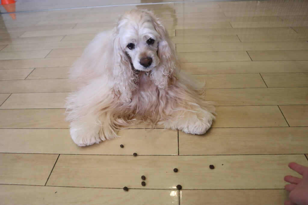 目の前で大好きなフードをばらまくと、必死な表情で待つベルちゃん!!