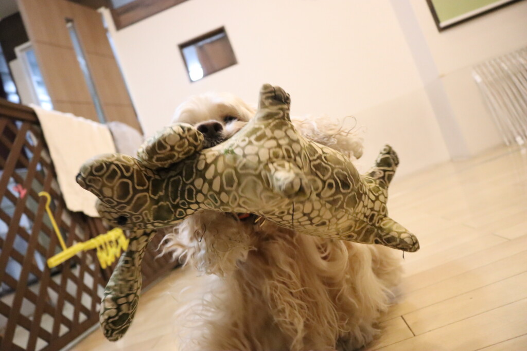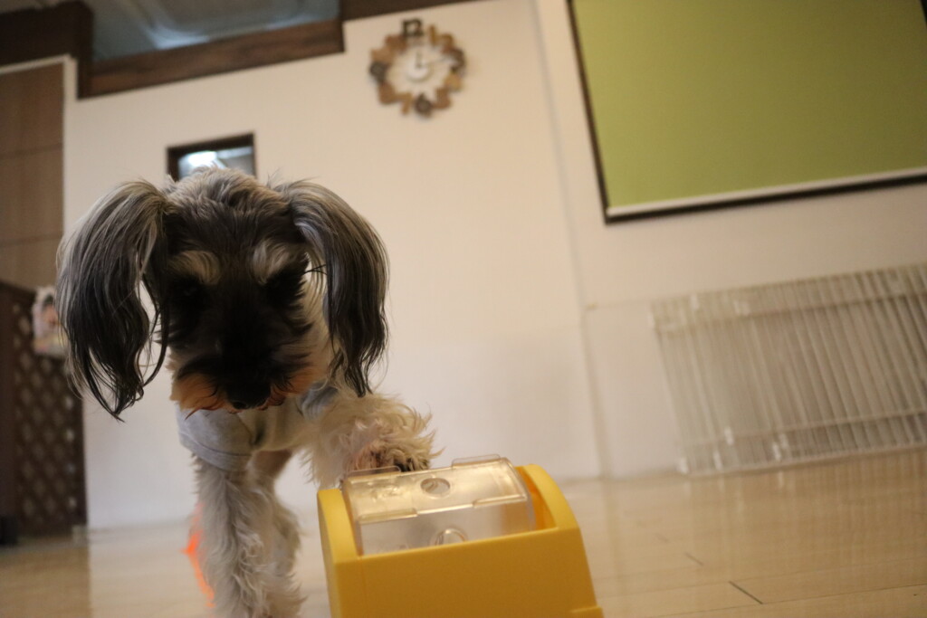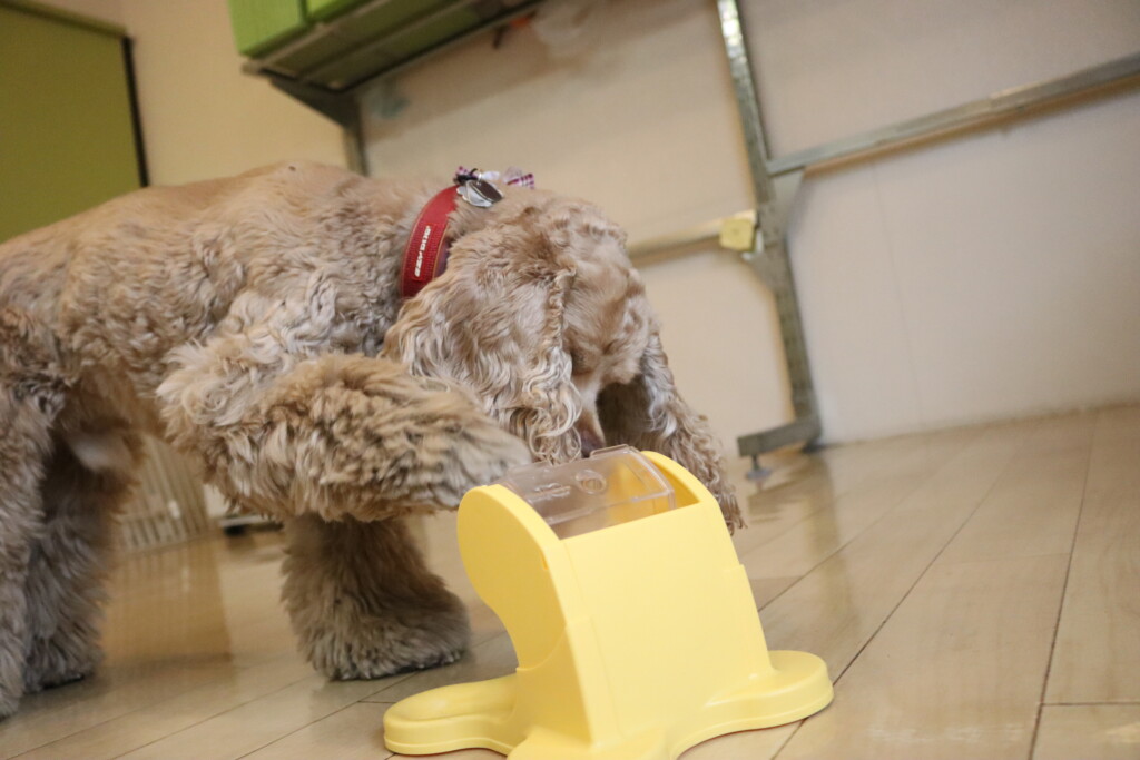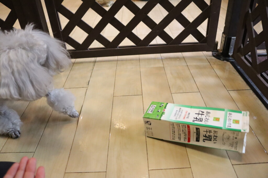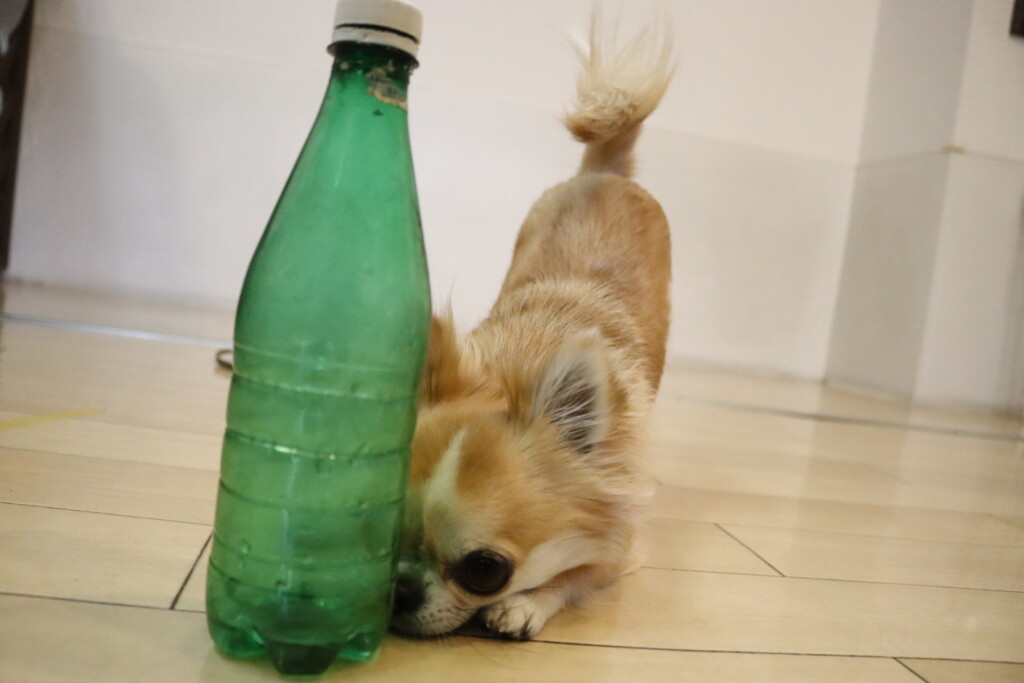 お水が入ったペットボトルを何度も倒すパピーくんです✨