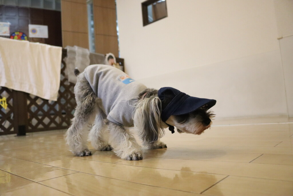 バンと開く音やトントンと床を突く音に慣れてもらえるよう、フードをあげながら練習!