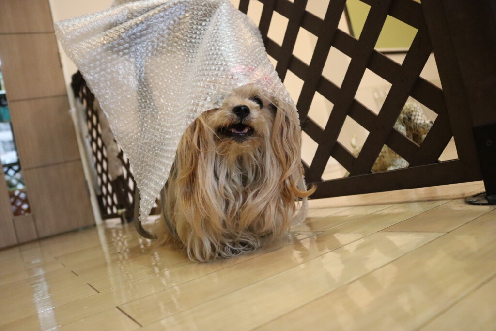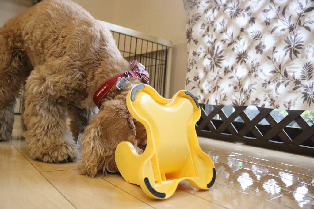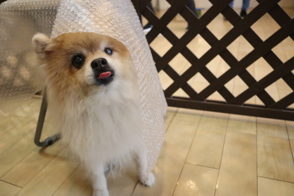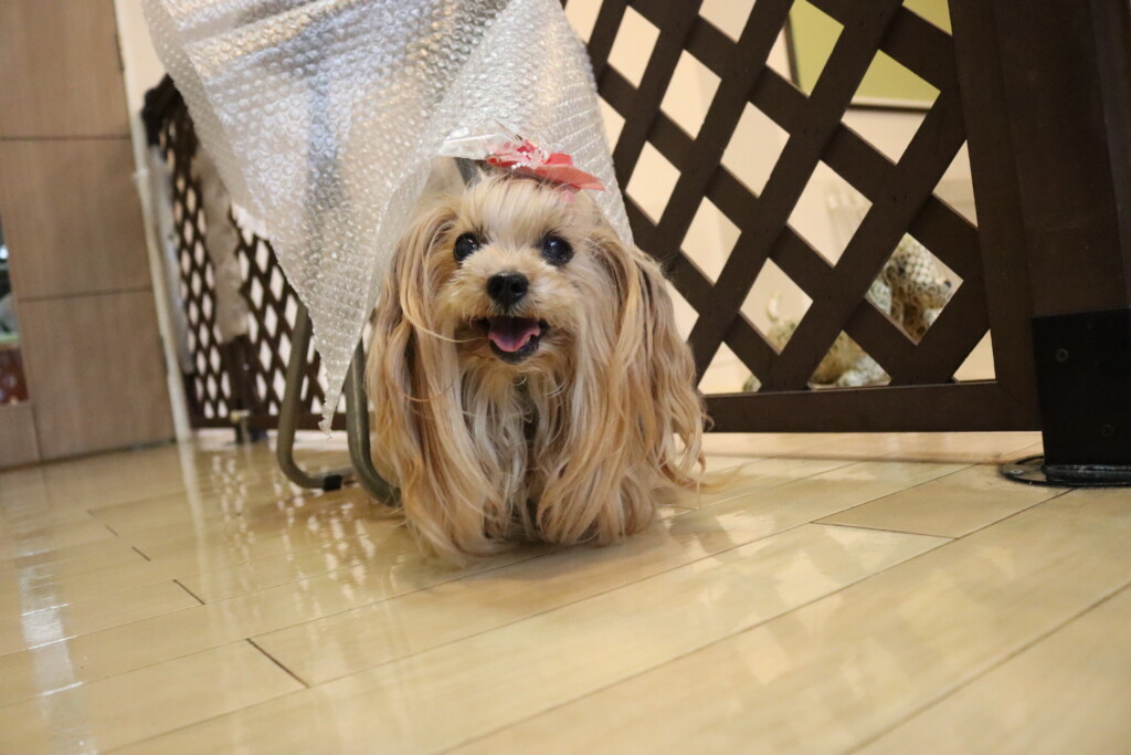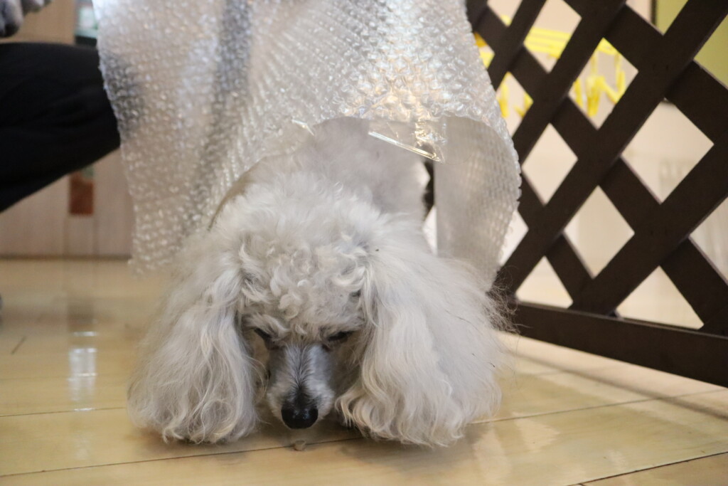 緩衝材が掛かったイスも気にせずにくぐり抜けるりれらちゃん✨