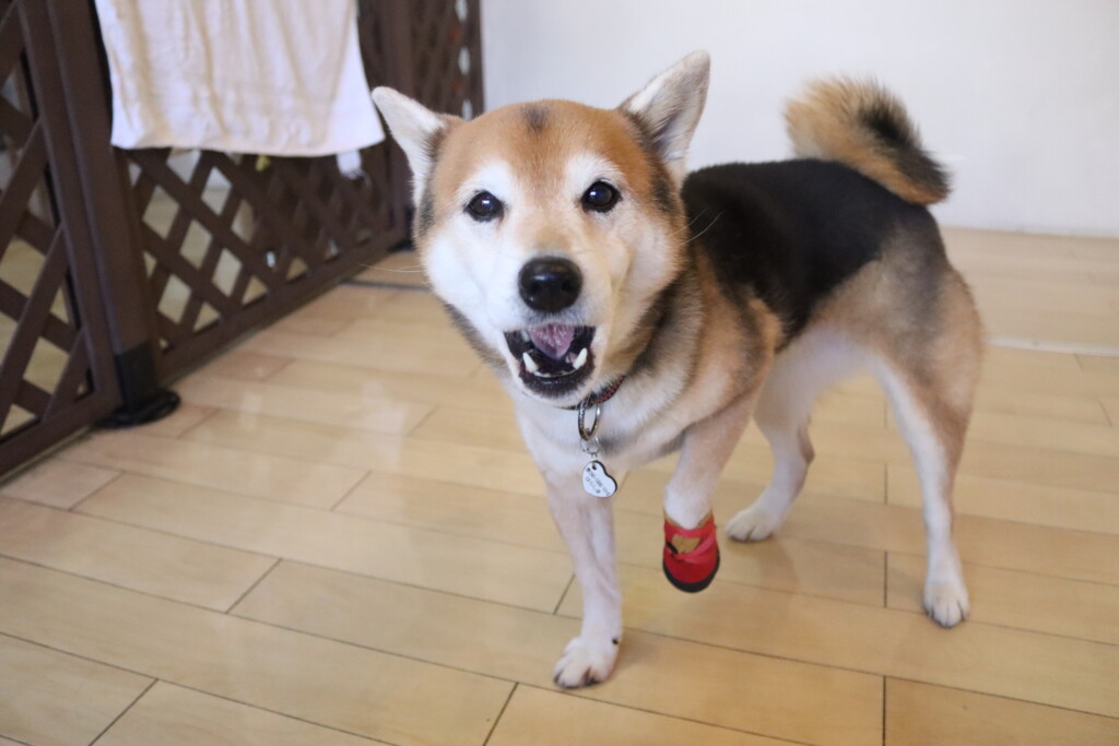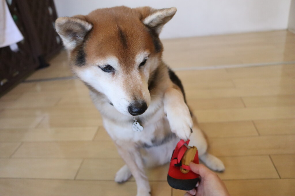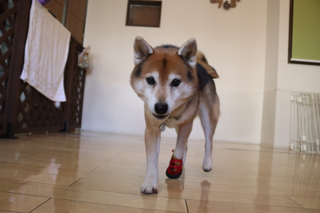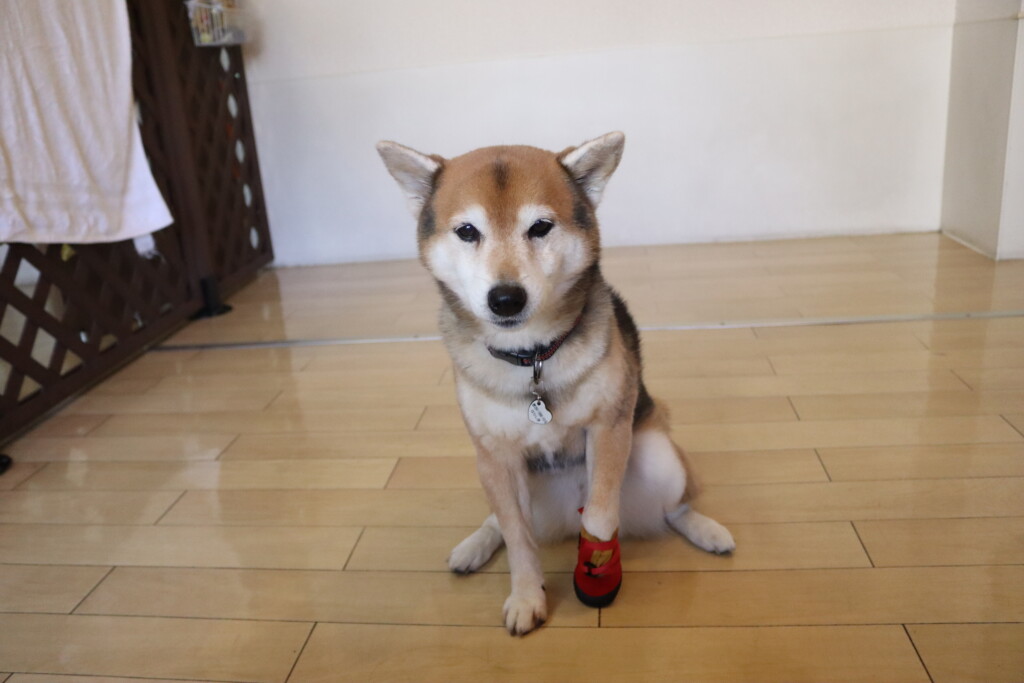 靴を履かせてみると、違和感たっぷりでどんよりな表情の甜ちゃん…