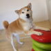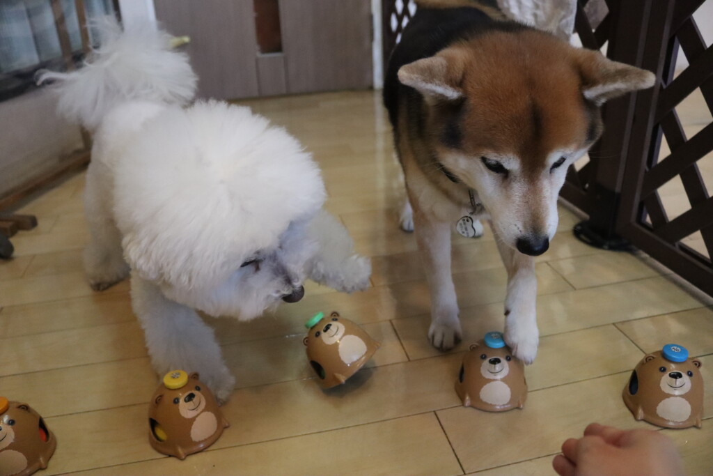 パピーくんも水の入ったペットボトルを倒すことに挑戦!
