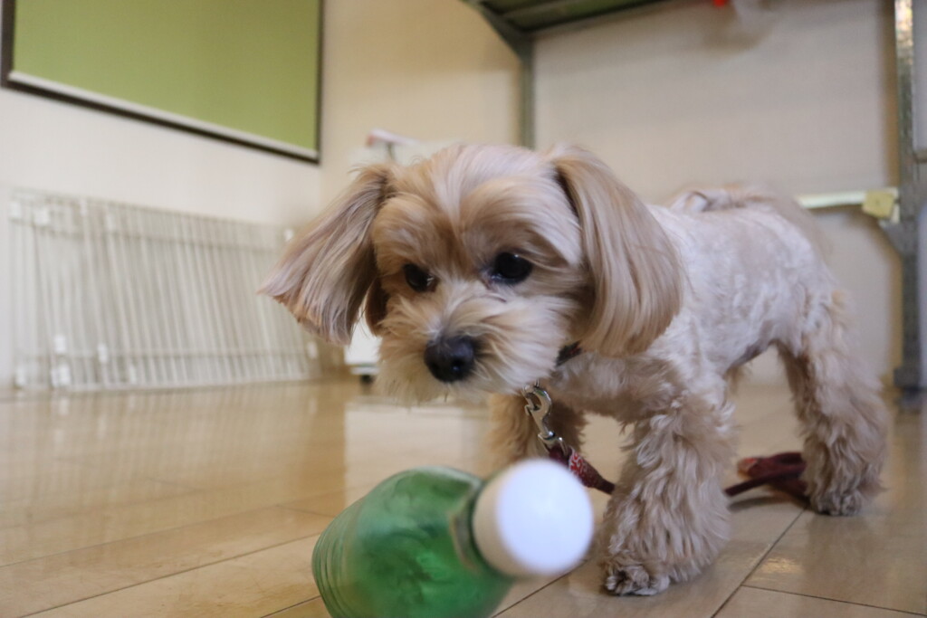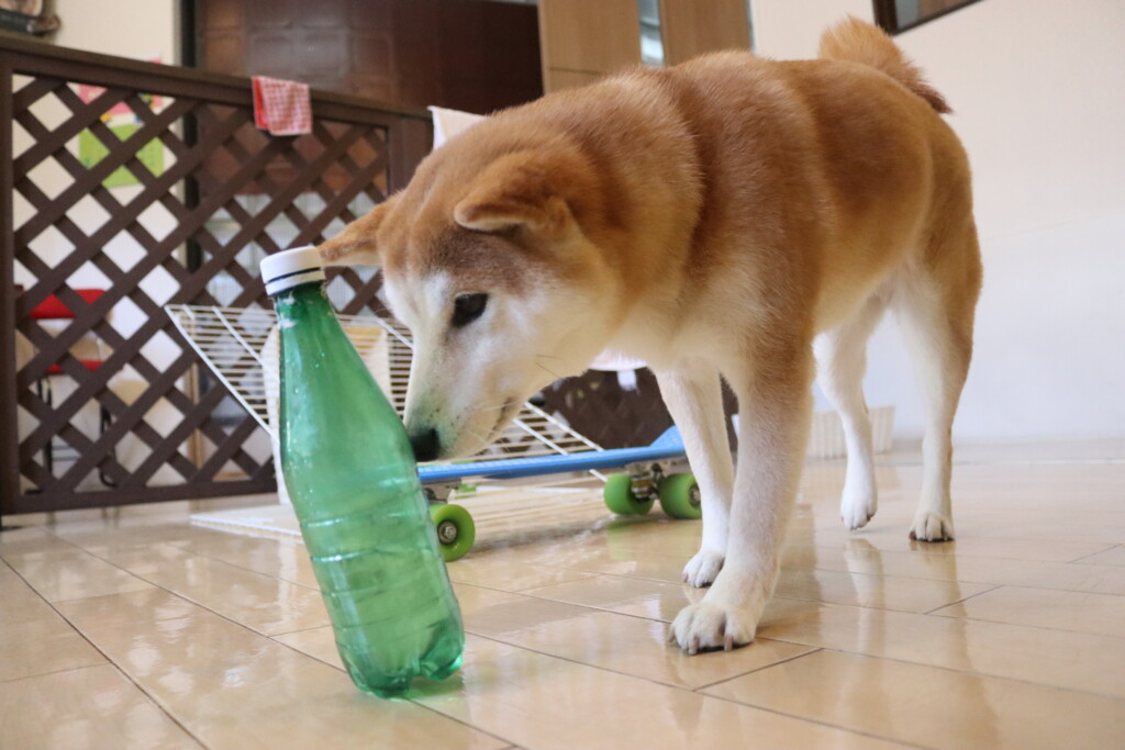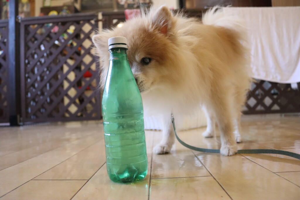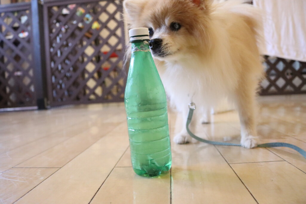 それでも倒れず、「なんで?なんで?」と不思議そうにペットボトルを見つめるパピーくんでした😂