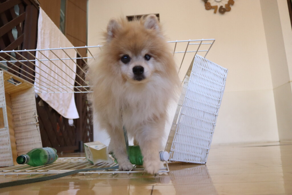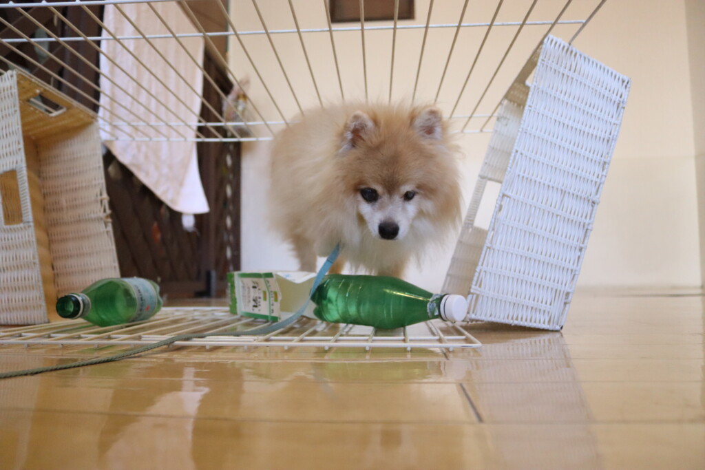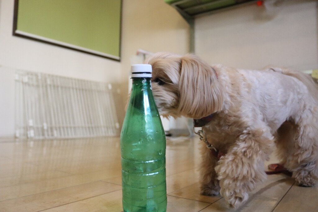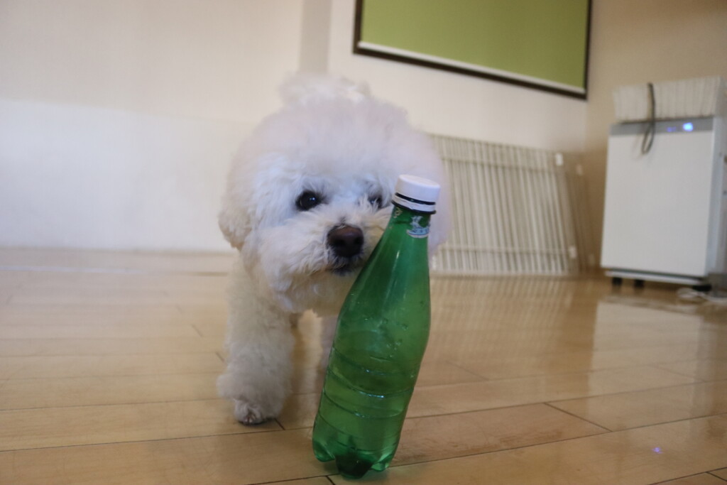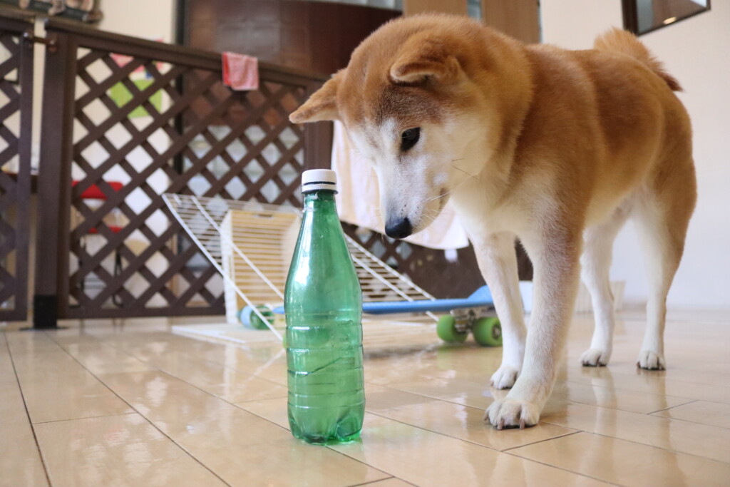 それでも倒れず、「なんで?なんで?」と不思議そうにペットボトルを見つめるパピーくんでした😂