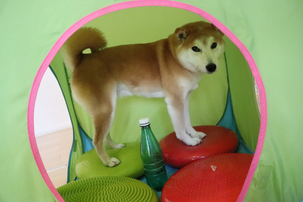 小春ちゃんはテントとバランスディスクで作ったアスレチックで体を動かしました!