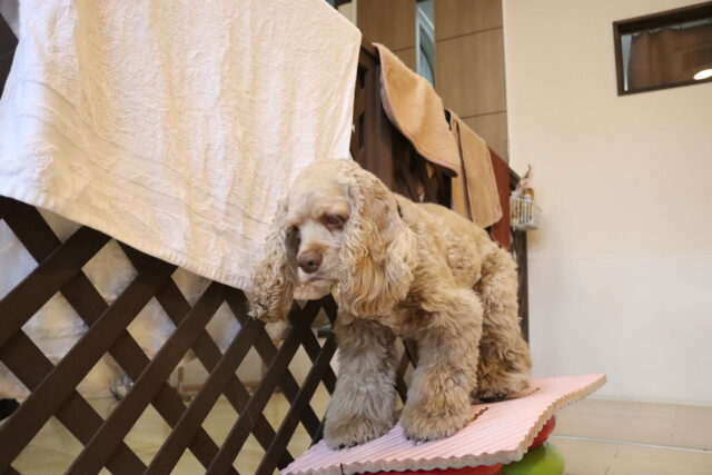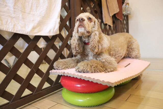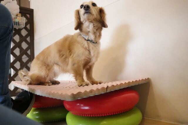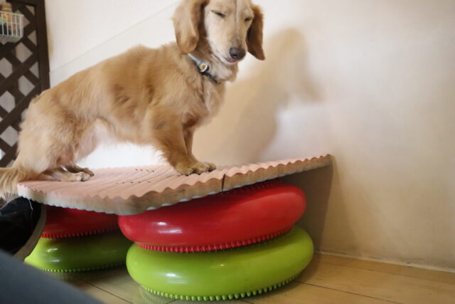 テトラくん、麦ちゃん、金ちゃん、らんくんはバランスディスクの上にある不安定なバスマットに乗って筋トレ&足場慣れ!