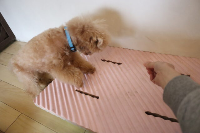 金ちゃんはバスマットの穴が気になるようでした🤭