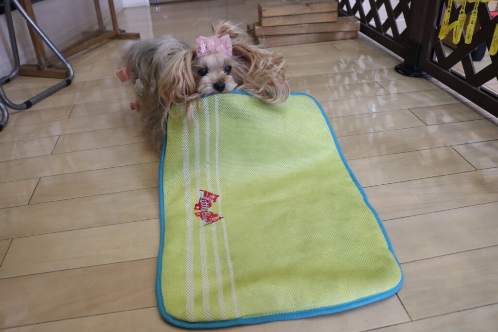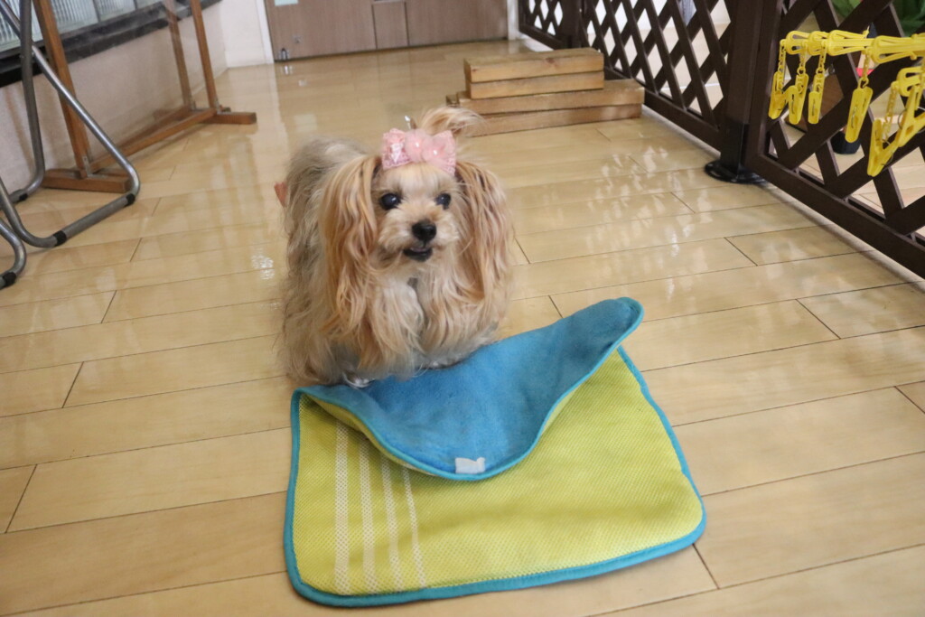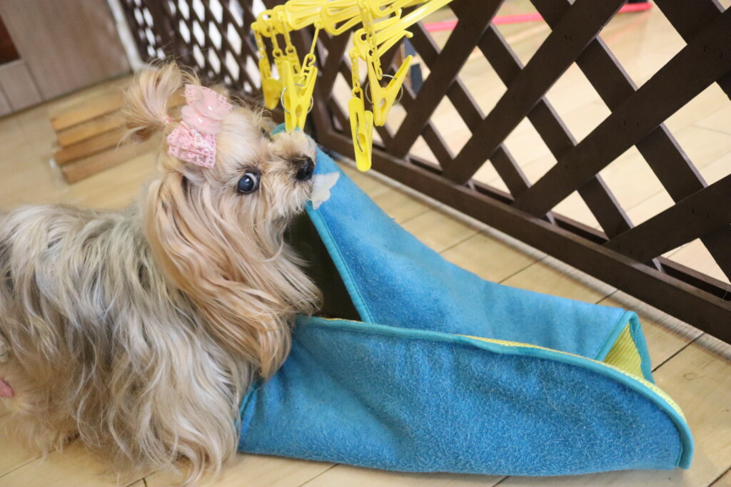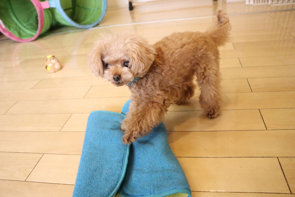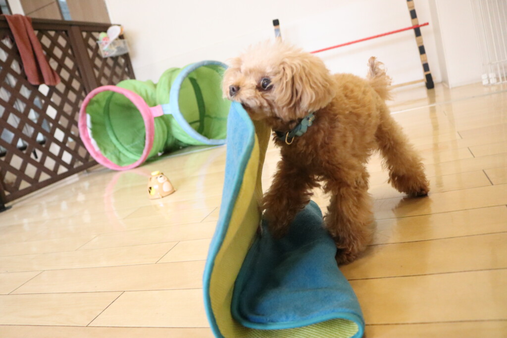 ”お洗濯”の練習では、今回はおもちゃではなくマットの取り込みに挑戦!
