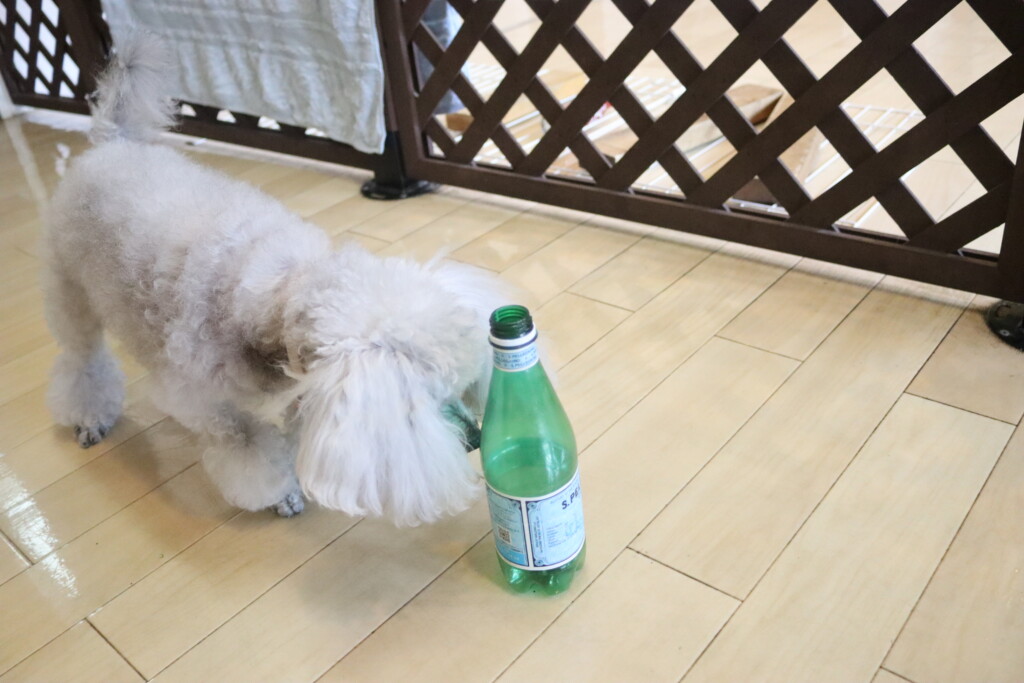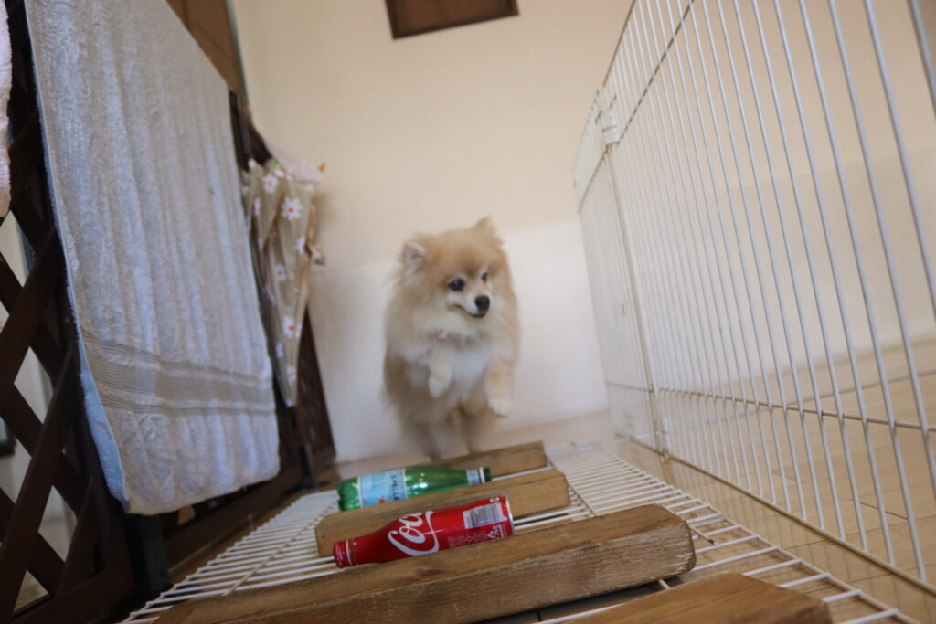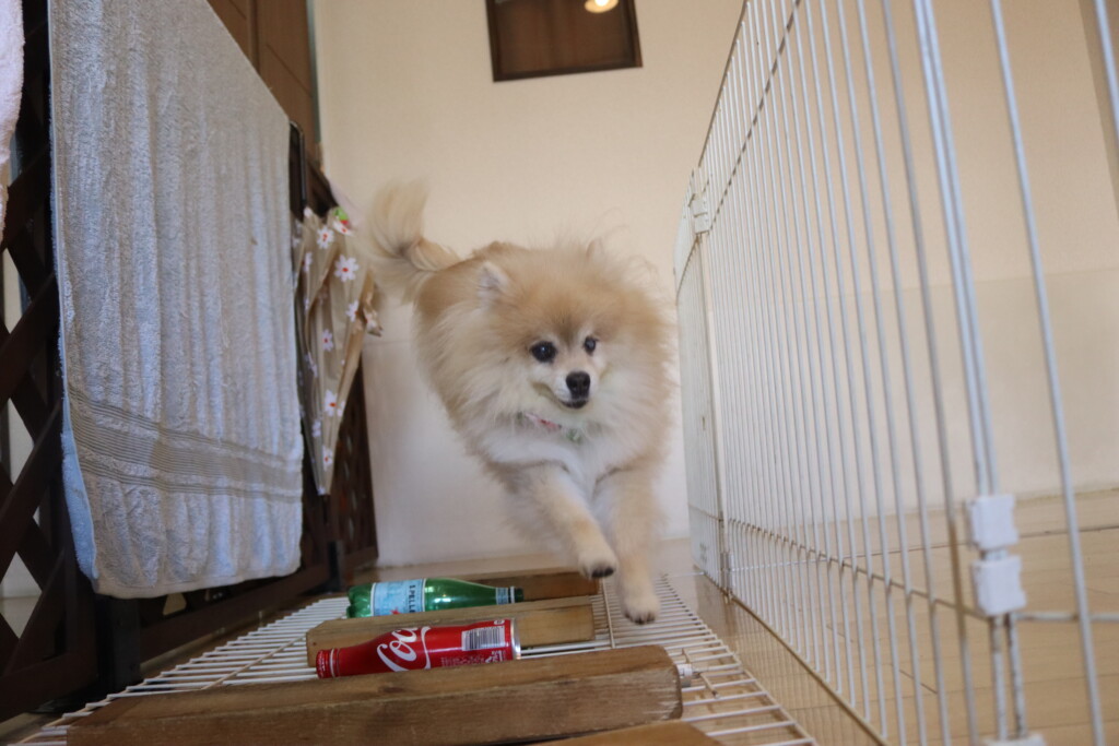 板やペットボトルなどの物に当たらないようサークルの上を渡るらんくん!
