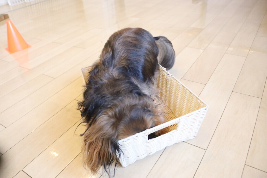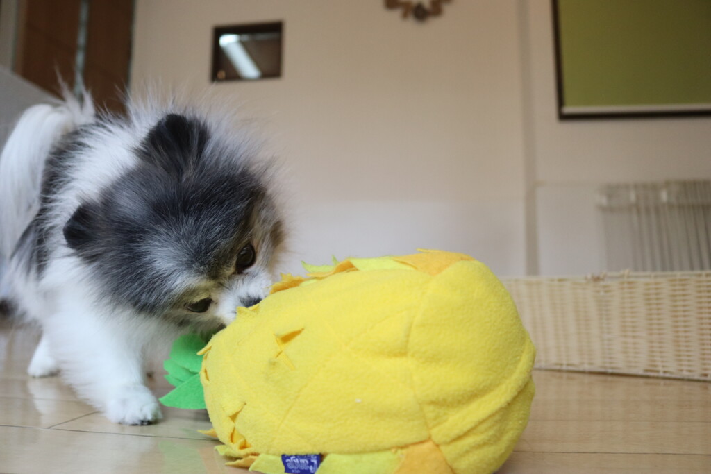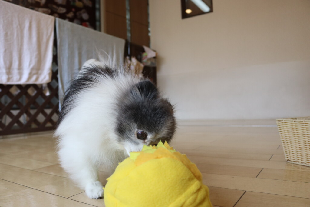 知育玩具では様々な場所に隠したフードを隅々まで探していましたよ♪