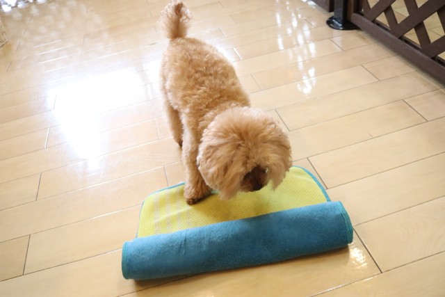 ゆーーっくりとですが、おやつの誘導でマットを広げ切ることに成功⭐少しずつ上達してきているね!