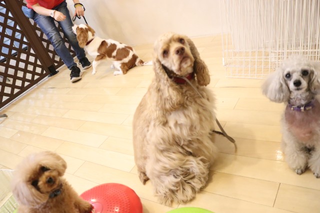 おもちゃが床に置いてある中での”呼び戻し”の練習!