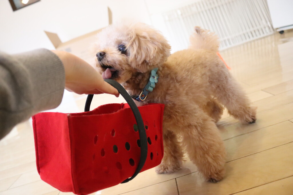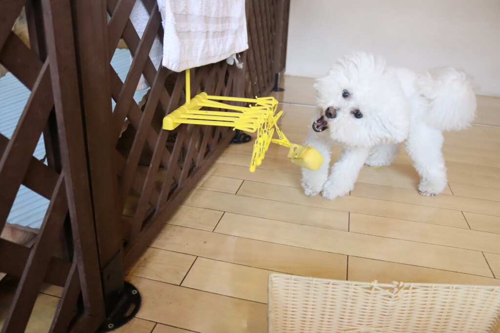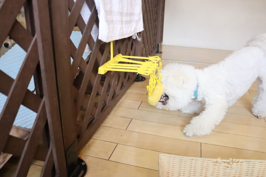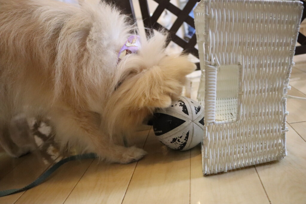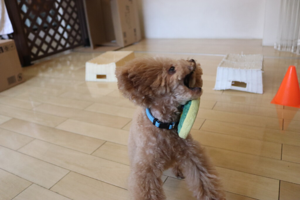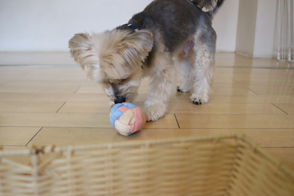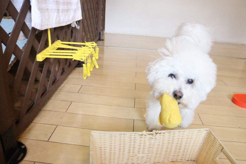 なかなか上手くオモチャを取ることが出来ず葛藤していましたが、オモチャをGETすることが出来るとカゴの中へ片付けてくれています♪