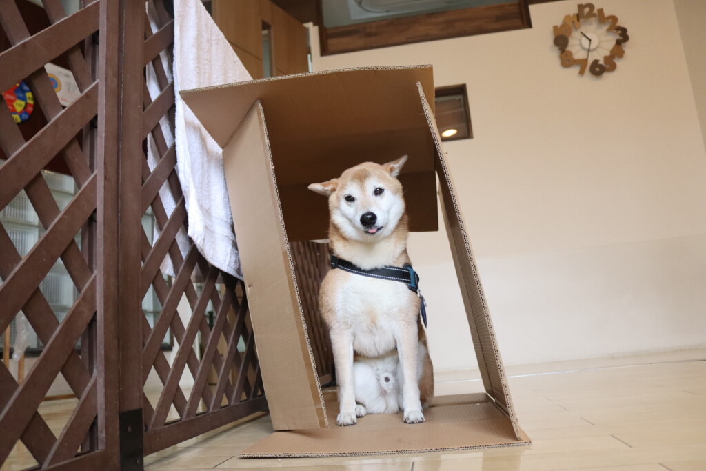 しばらくするとダンボールの中が心地よかったのか「ここから動きません!」と居座っていました(笑)