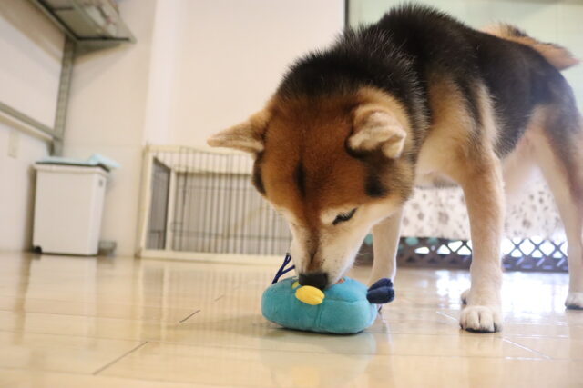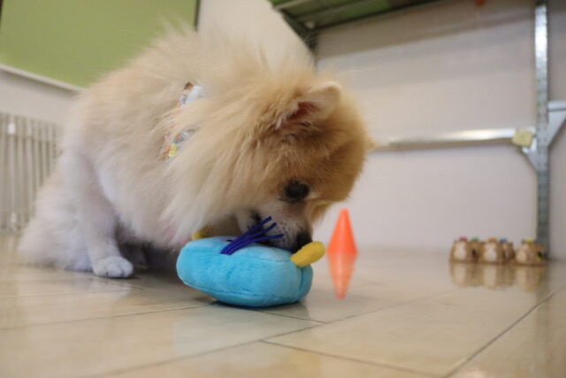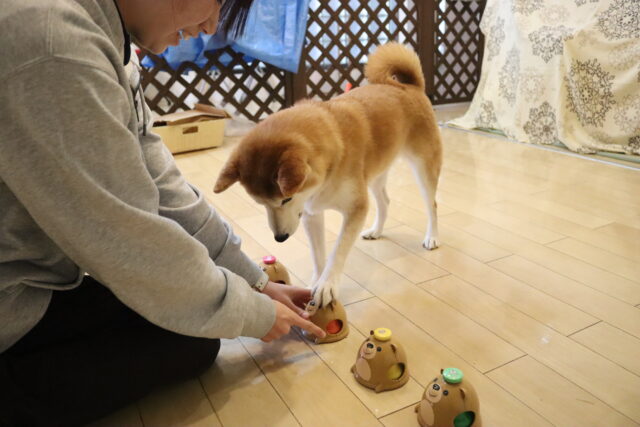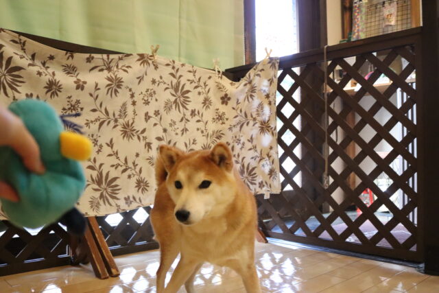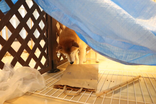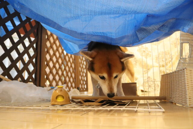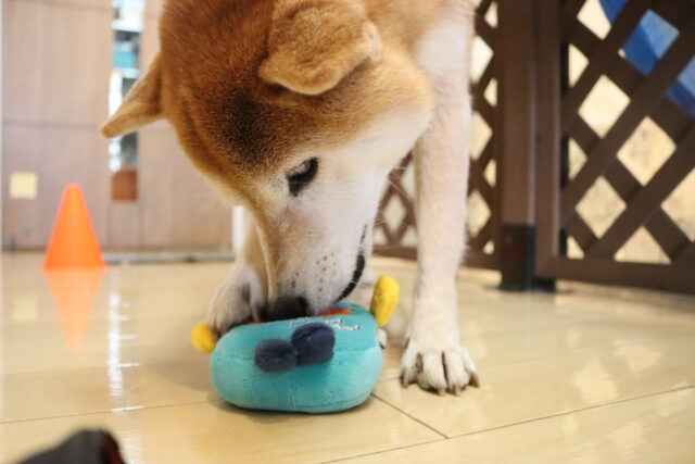 新しい知育玩具のオモチャには見慣れない物に警戒態勢!