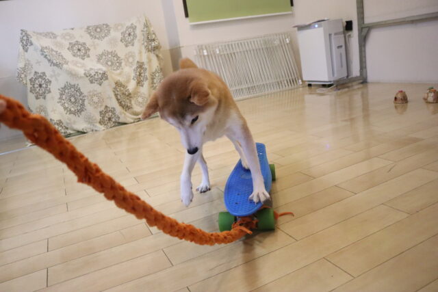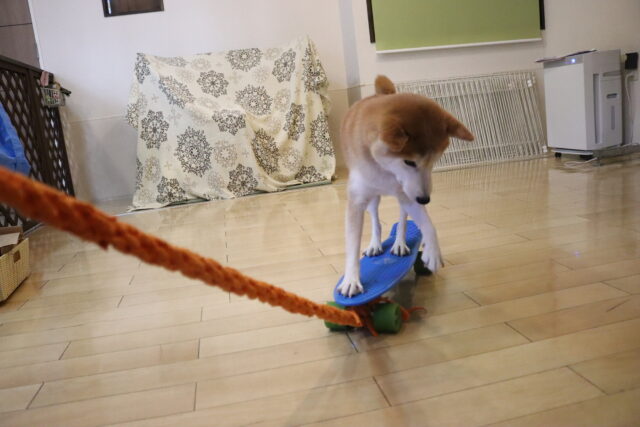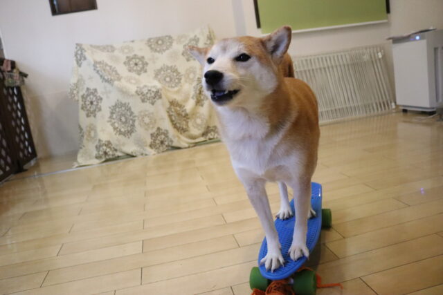 始めは勝手に動き出すスケボーにビックリしながらも…