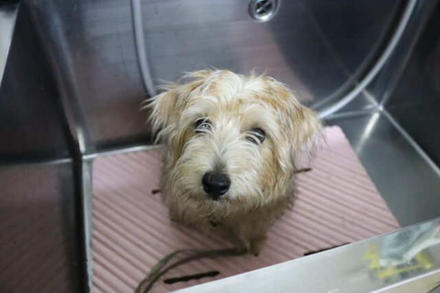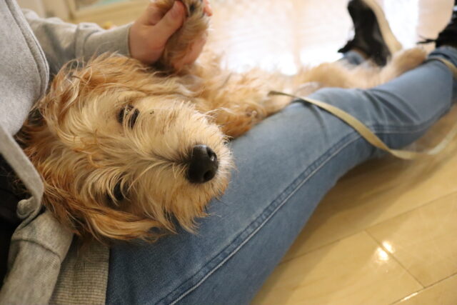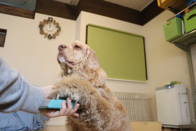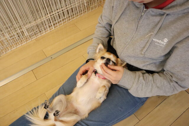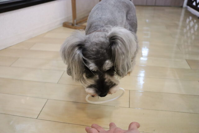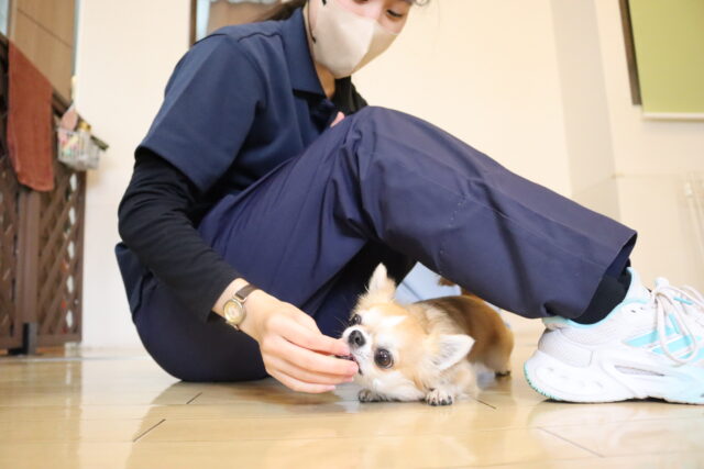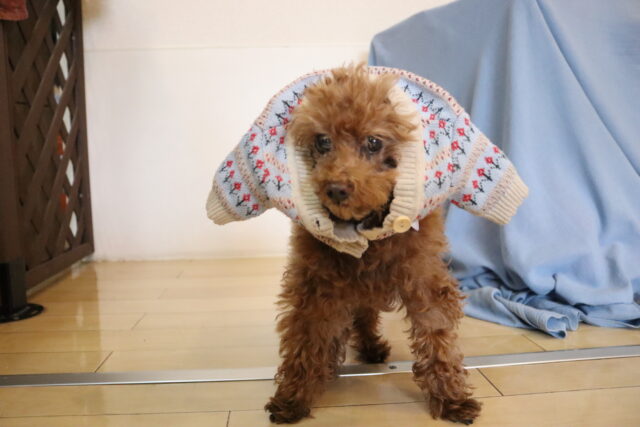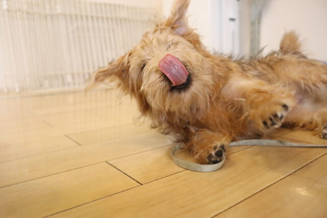 洋服の着脱練習ではスタッフに「ヒトデみたい」と言われ不満そうな表情のマロンくんでした(笑)