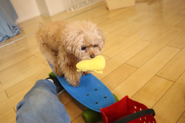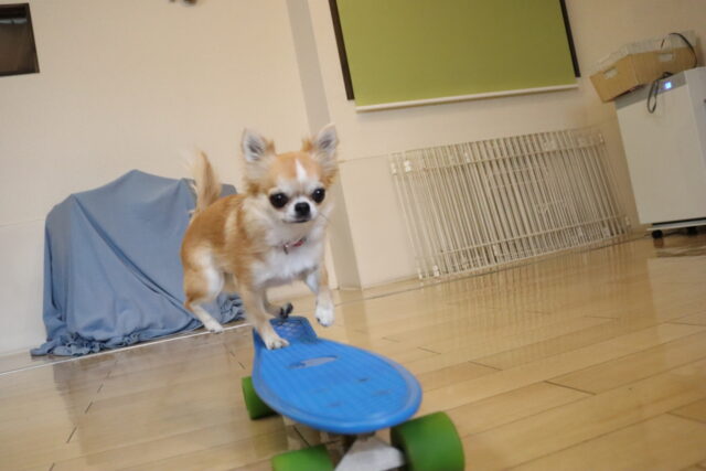少し難易度を上げてスケボーに乗りながら行ってみましたが、上手にカゴの中に入れてくれています♬