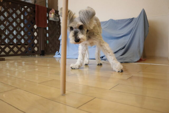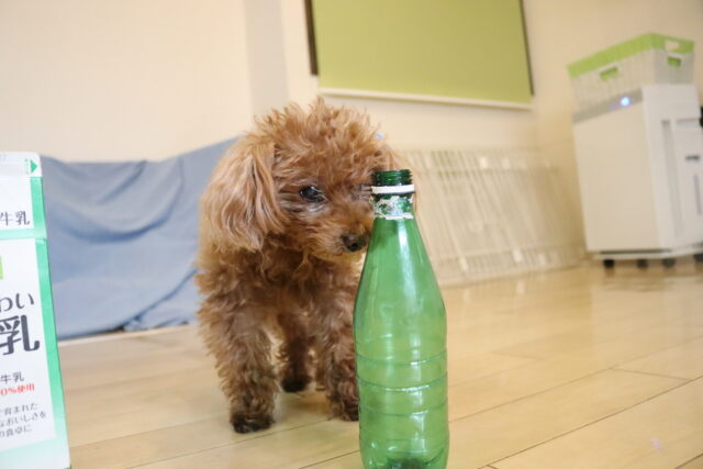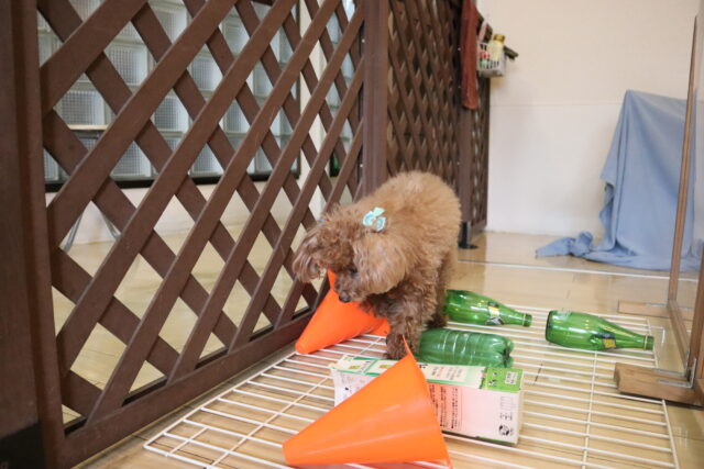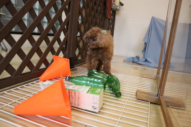 マロンくんは空き瓶などが置いてあるサークルの上を歩いて物・足場慣れ🌟