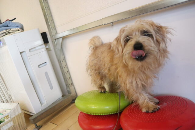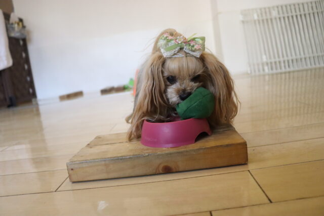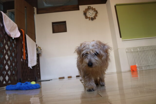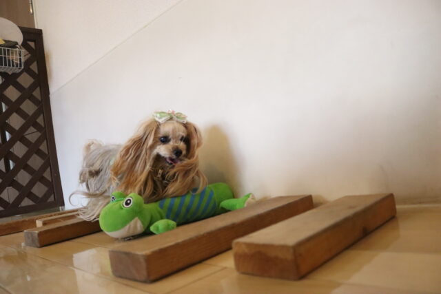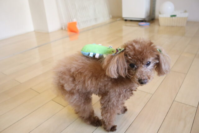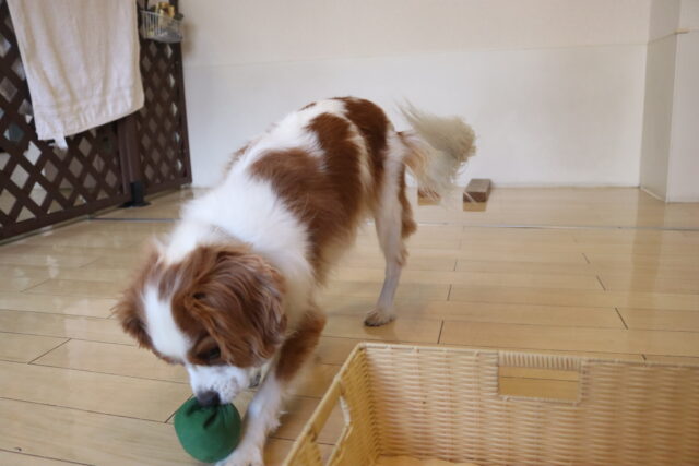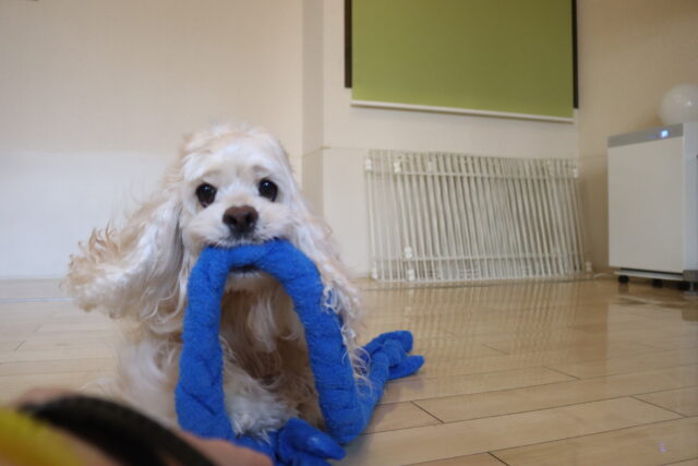 オスカーくんは大好きなおもちゃで思いっきり遊んだ後、