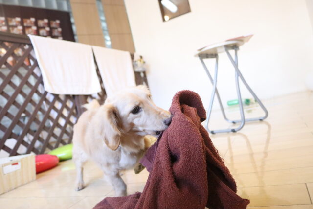 麦ちゃんは人形にタオルを掛けてあげる練習🎵