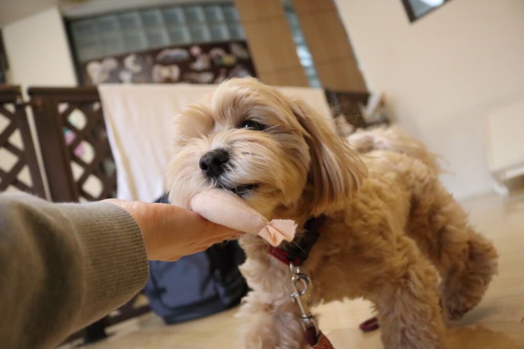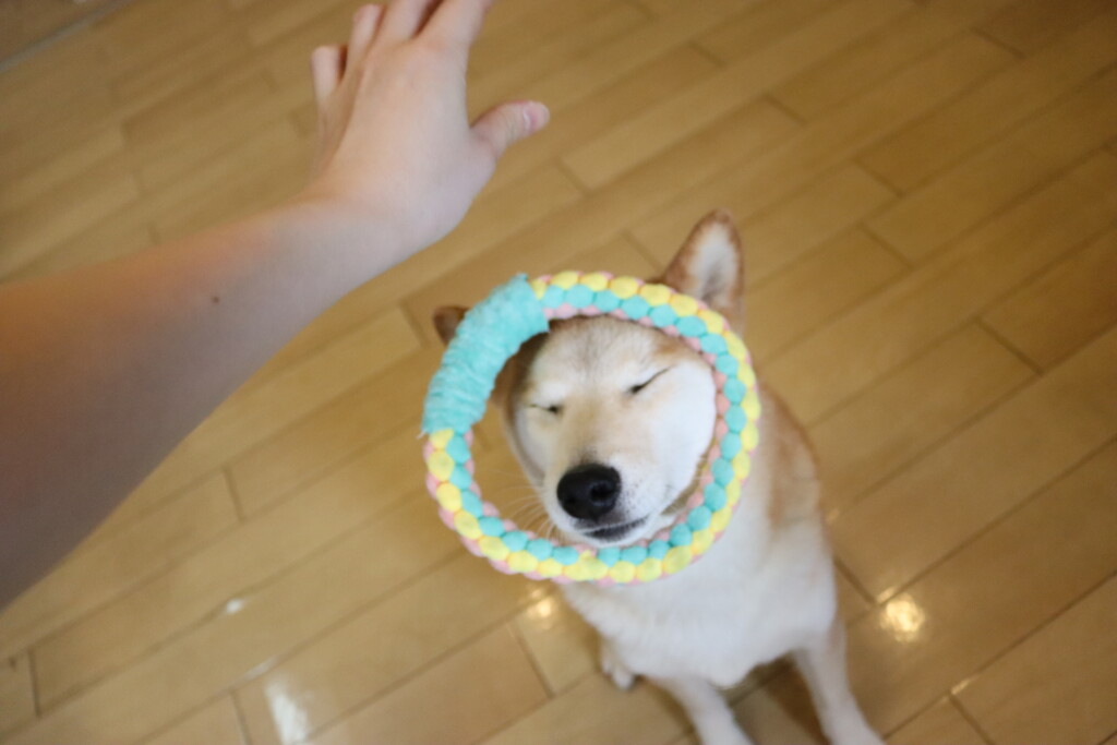 犬のぬいぐるみに輪っかを掛ける練習も行っています!