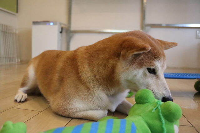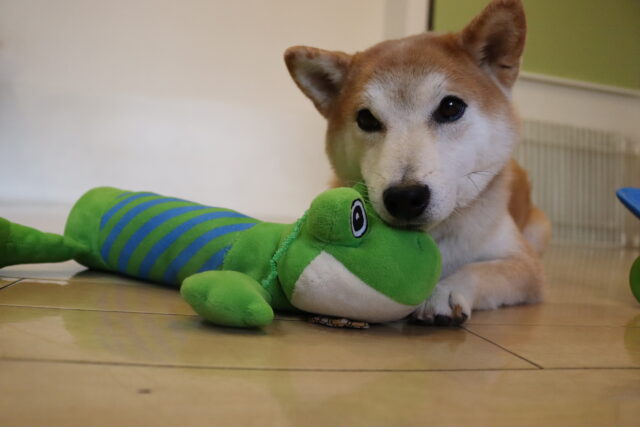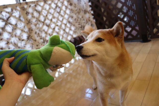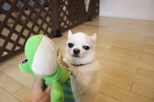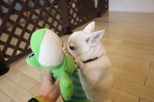 小春ちゃんは苦手なカエルのぬいぐるみを使って物慣れ!