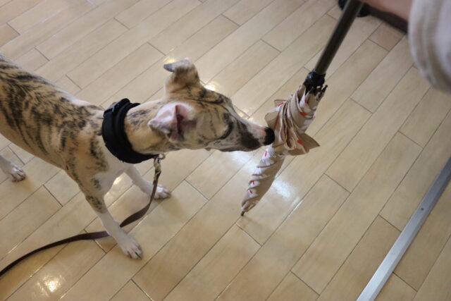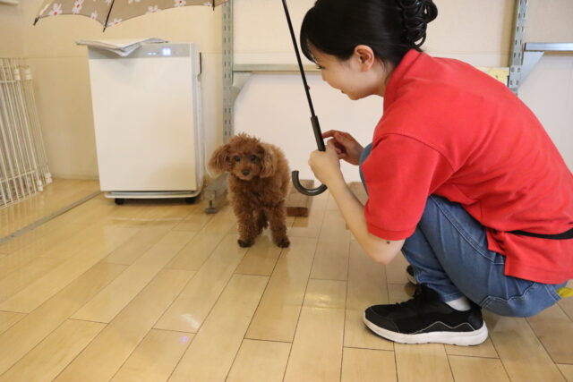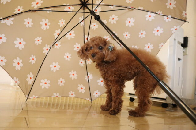 スタッフと相合傘をすると気まずそうな表情のマロンくんです(笑)