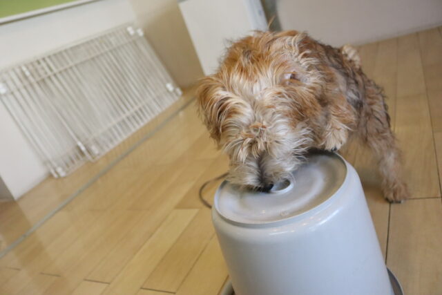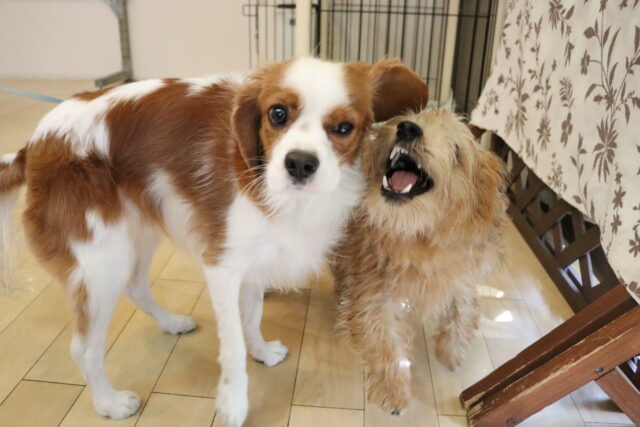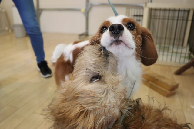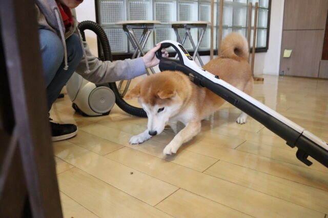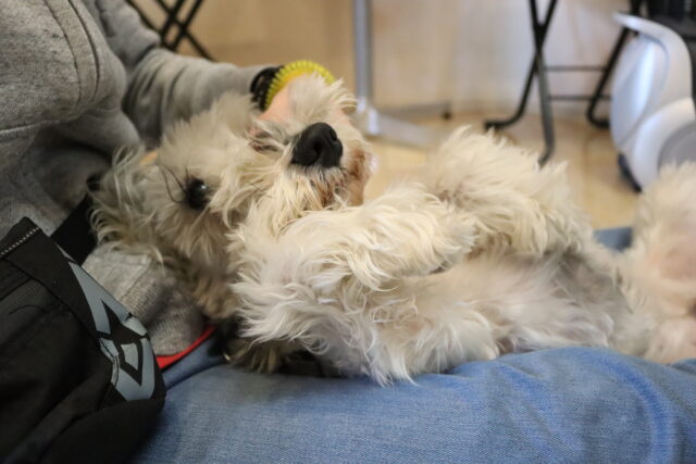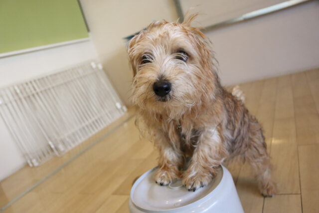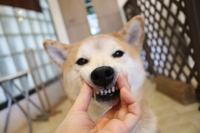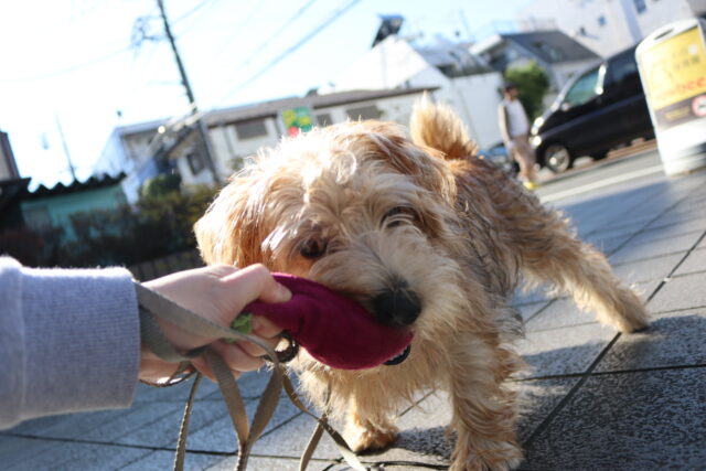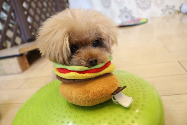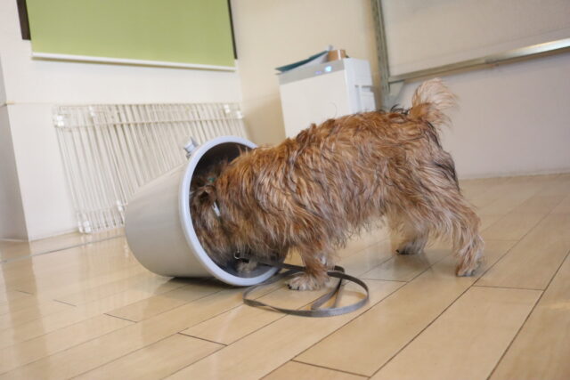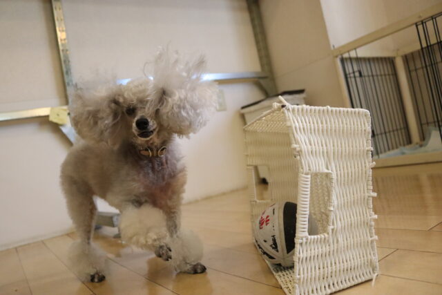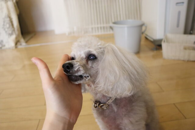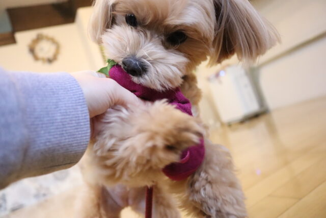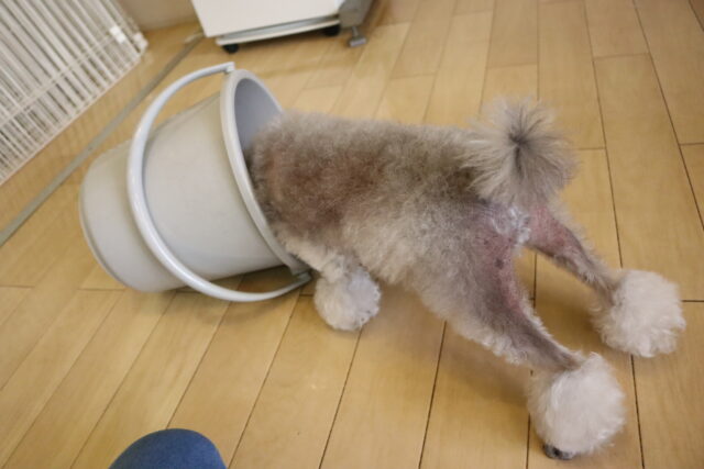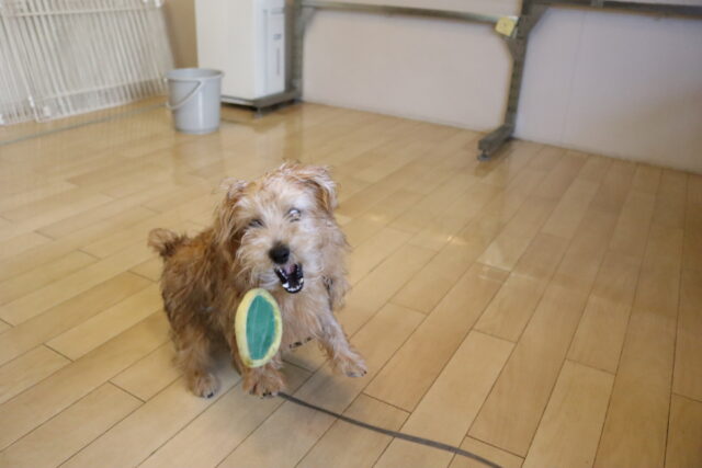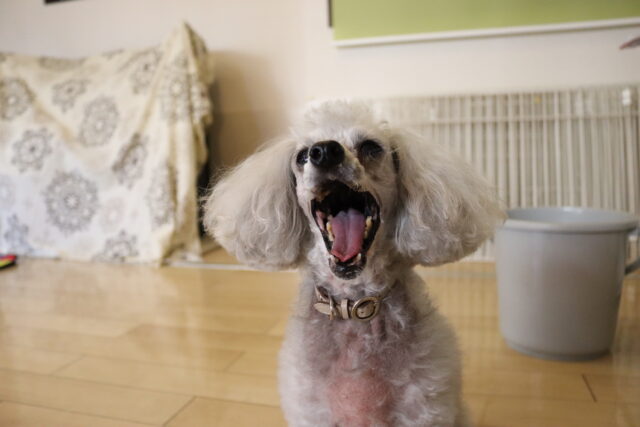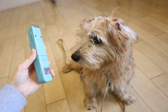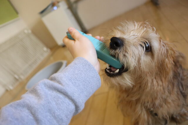 ケアで使うバリカンを見せてみると、こちらはおもちゃ認定されたようで大きなお口でガブリ😂