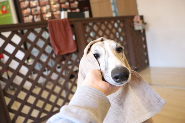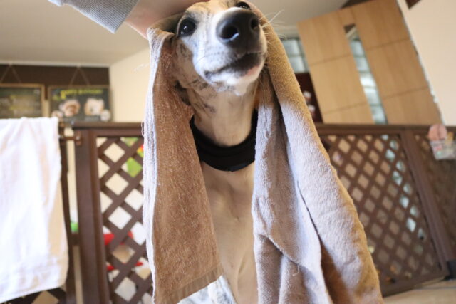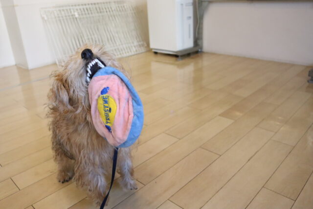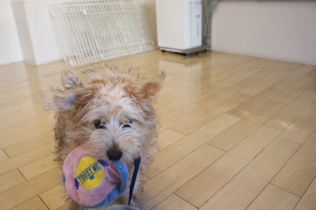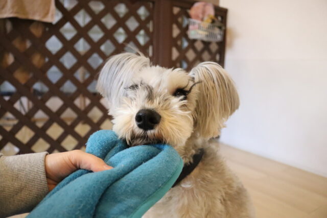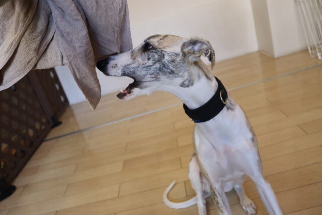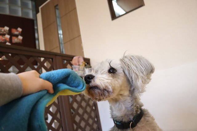 体をふく練習ではタオルを持ってくると「オモチャだ~!」と咥えようとする姿をパシャリ📸