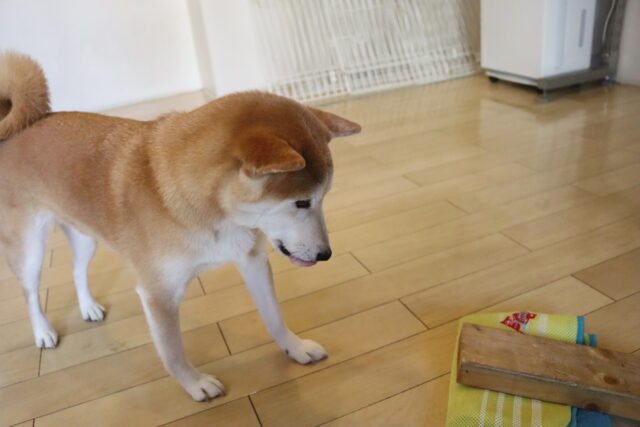 マットの端を咥えてもらうため顔の前にマットを見せると…