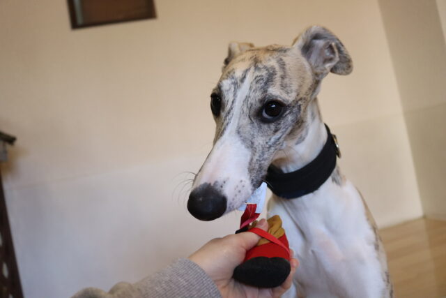 着用しようとすると見慣れない物に不思議そうな表情をし…