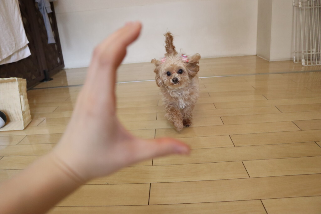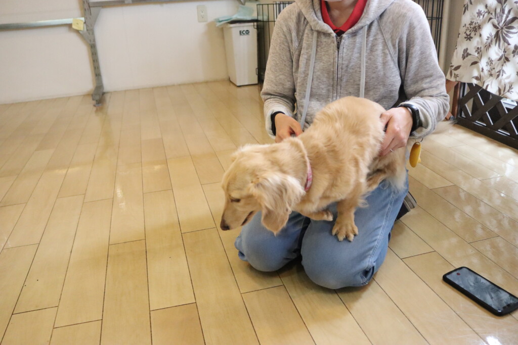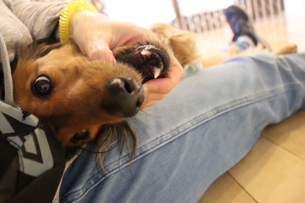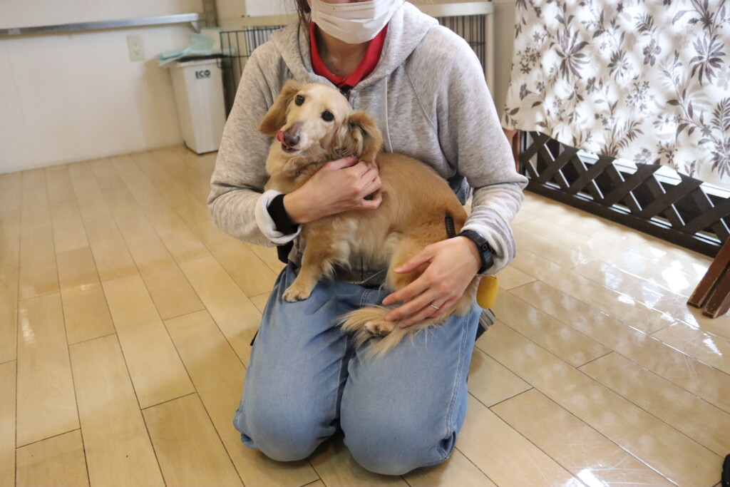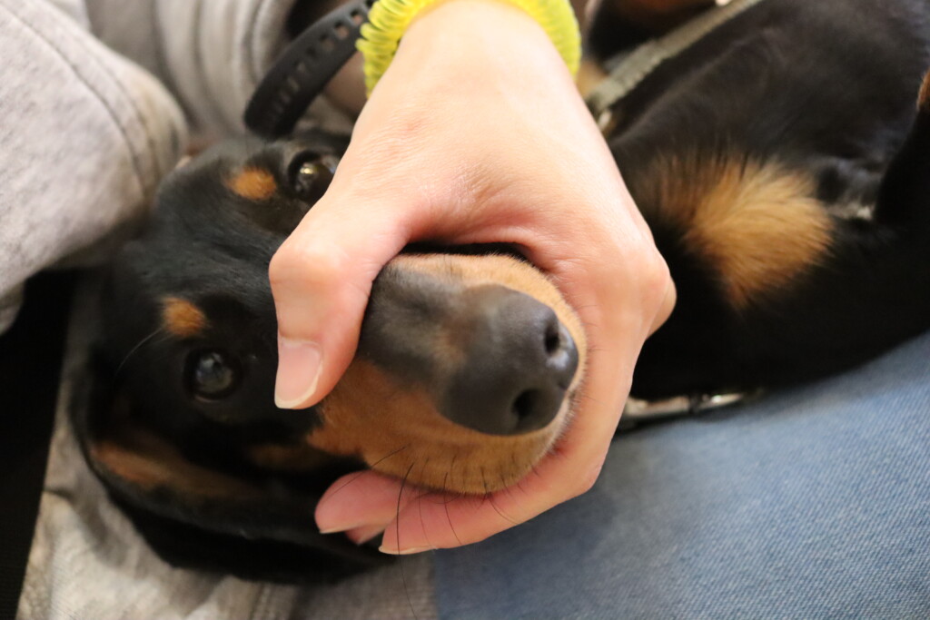 耳を羽ばたかせながらルンルンで走り、そのままスタッフの手の中にスッポリと顔を入れてくれています♪