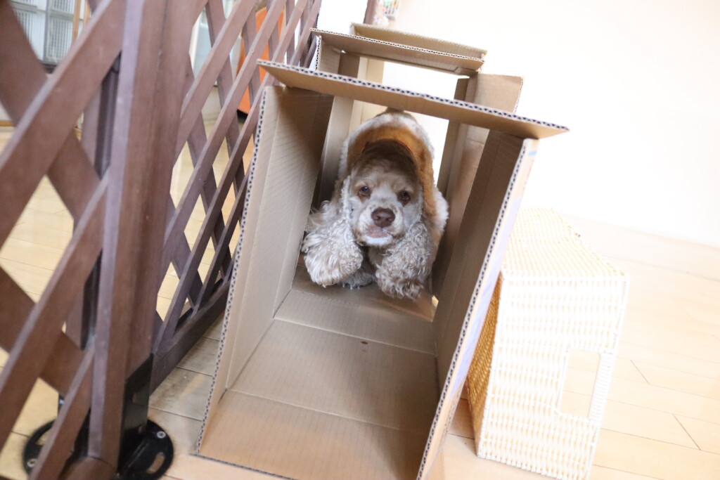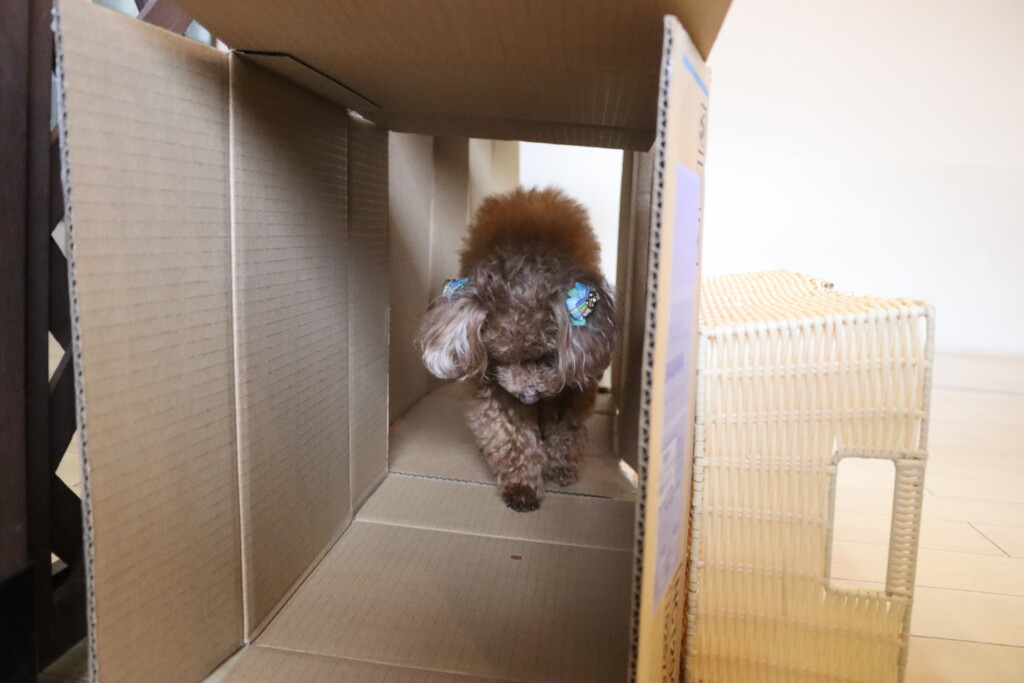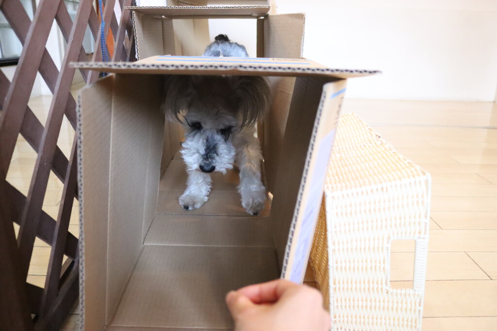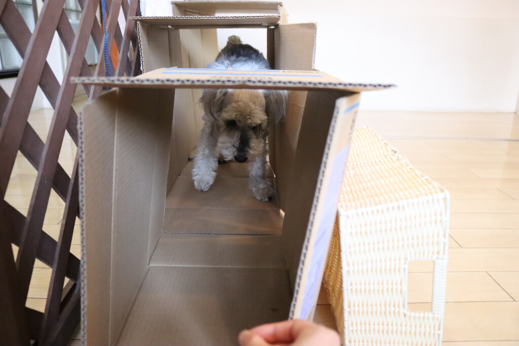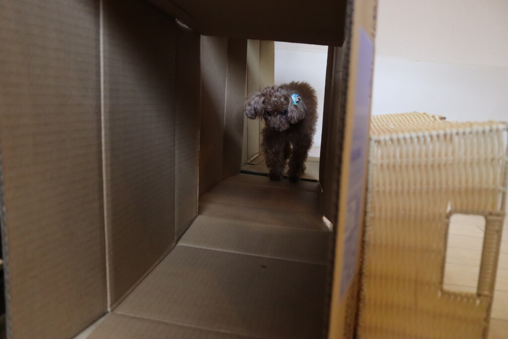 マロンくん、テトラくん、ショパンくんは段ボールを3つ並べた長~~い段ボールトンネルに挑戦!