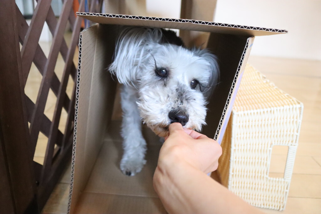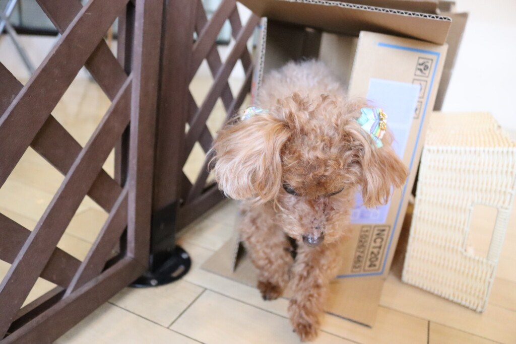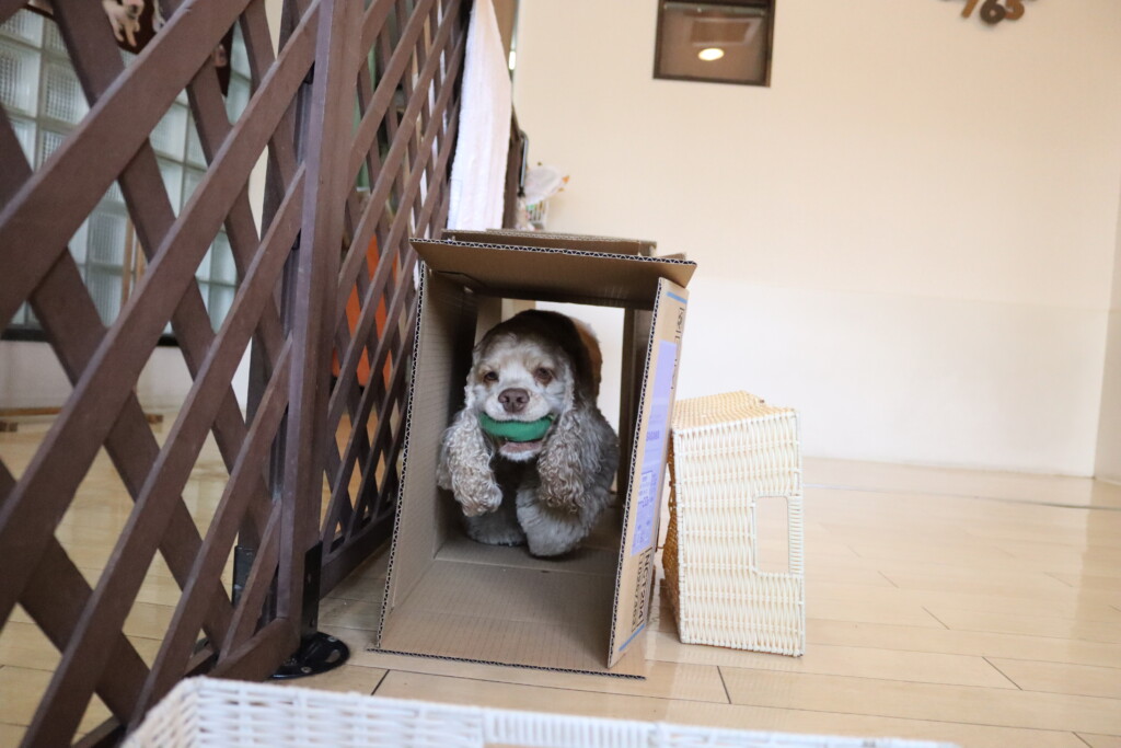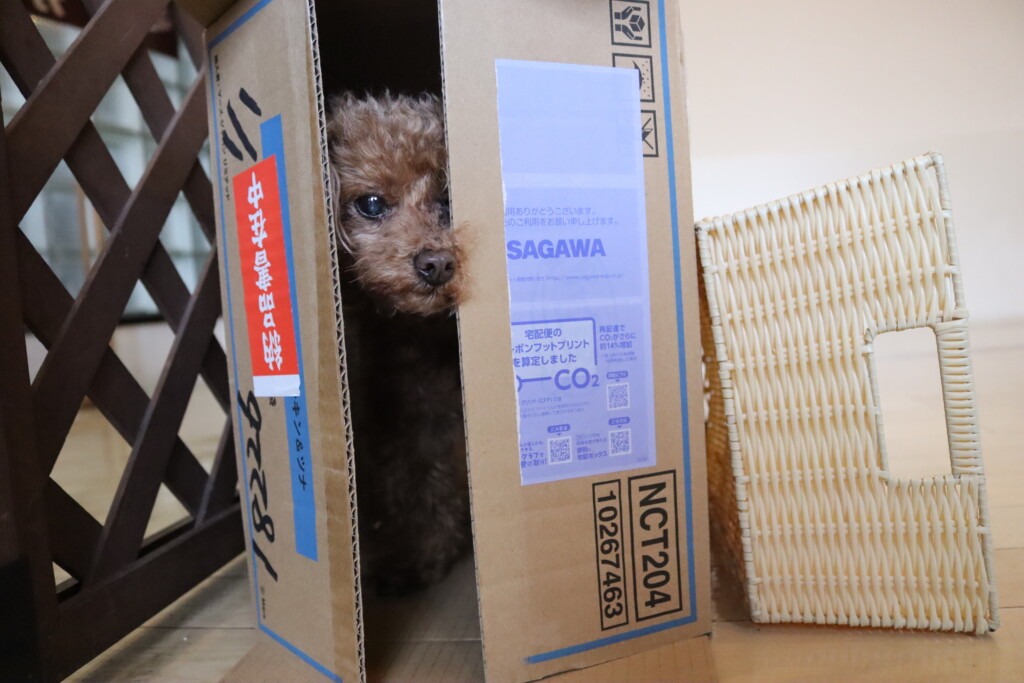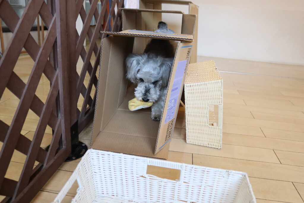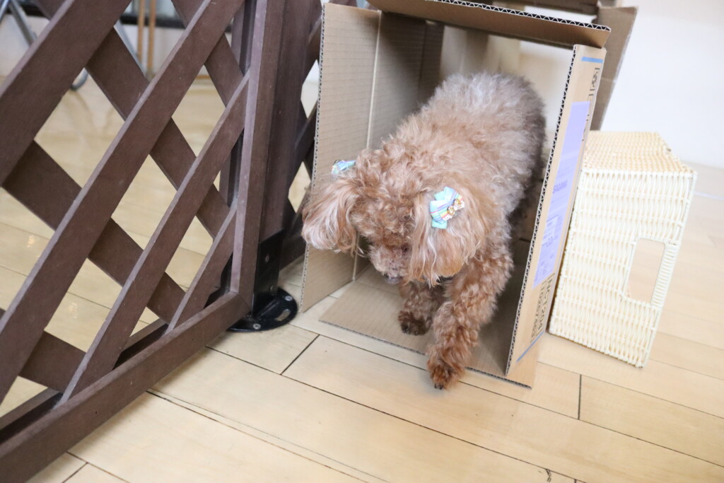 マロンくん、テトラくん、ショパンくんは段ボールを3つ並べた長~~い段ボールトンネルに挑戦!