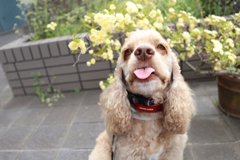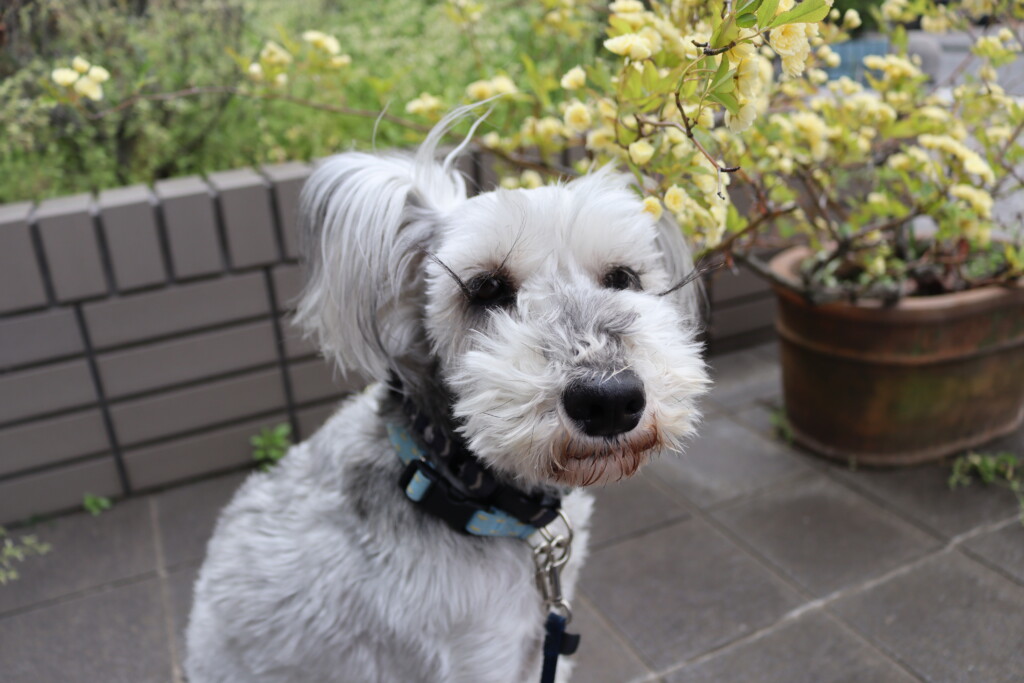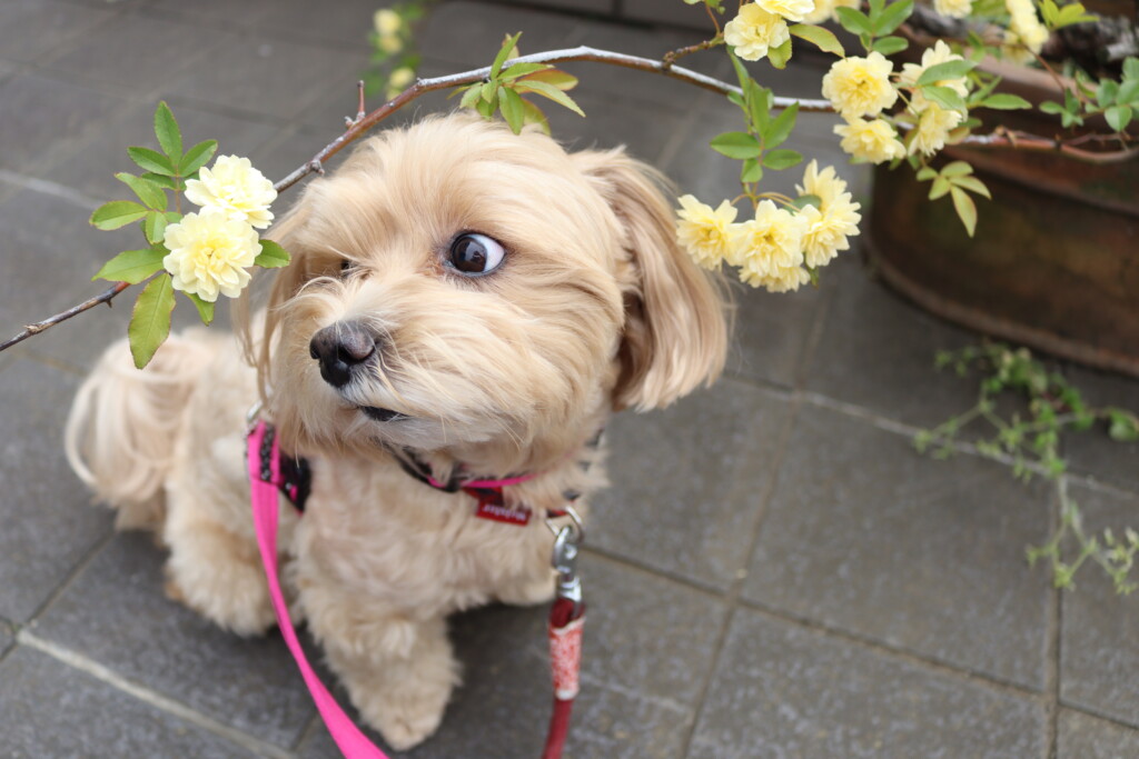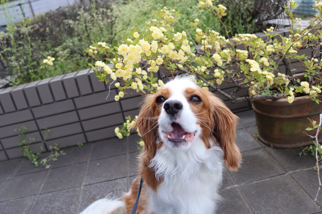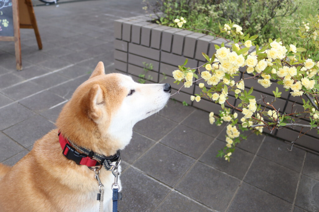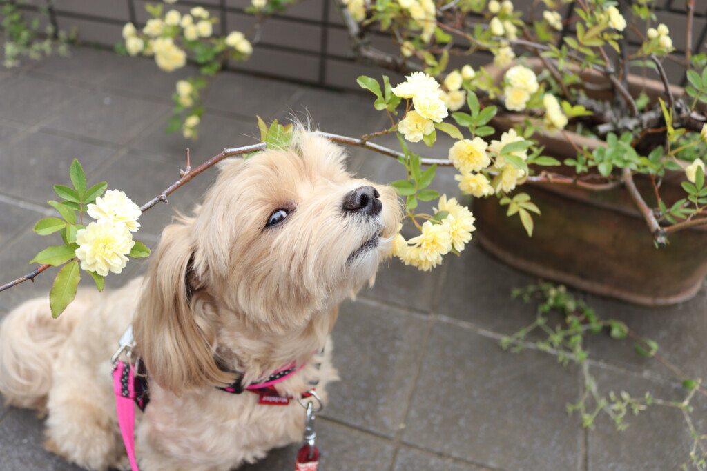 お散歩練習では黄色のお花を見つけると「良い匂い!」と夢中になって匂いを嗅いでいると…