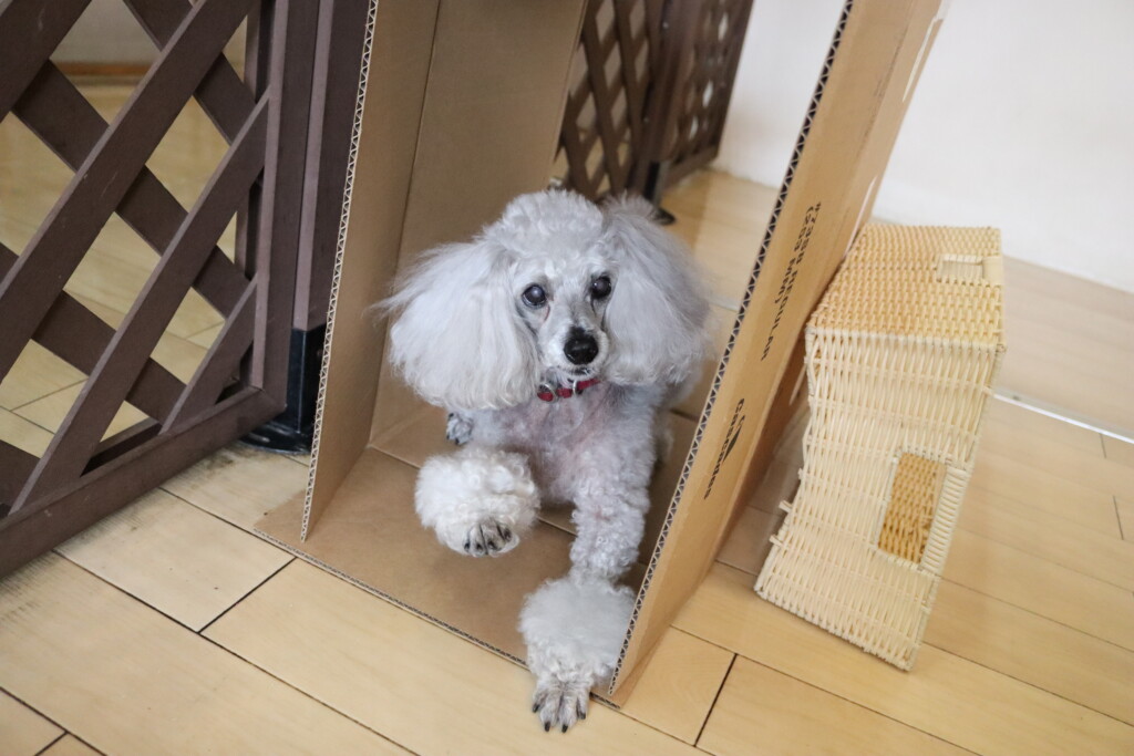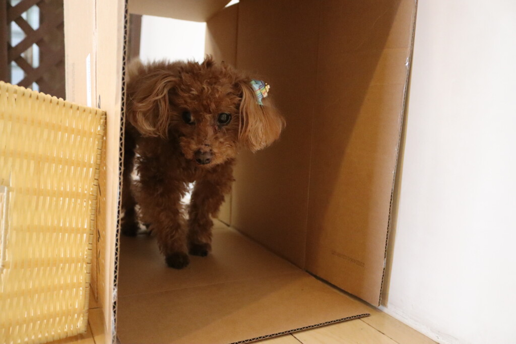 マロンくんはダンボールで作ったトンネルくぐりをしています!
