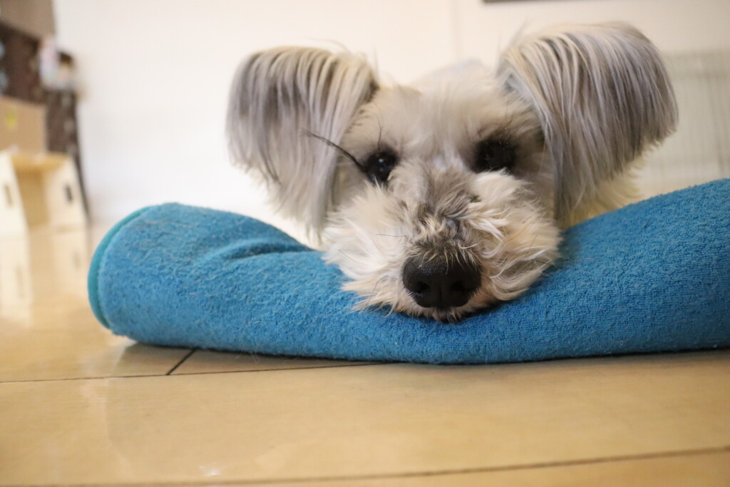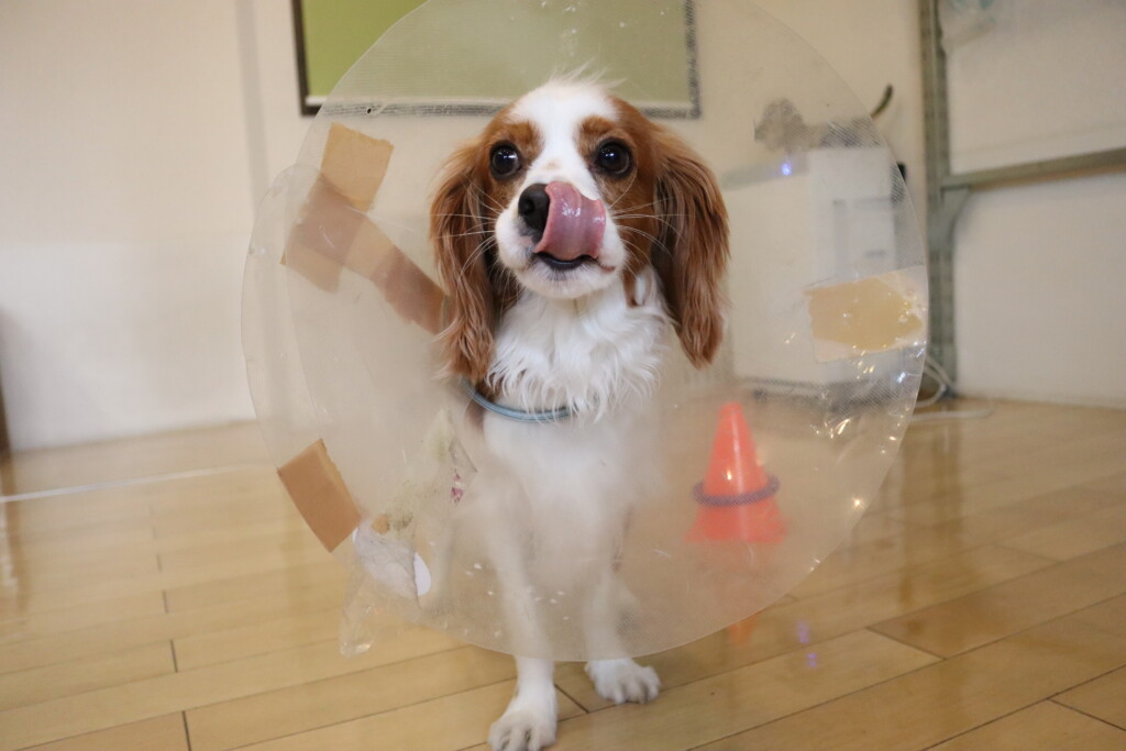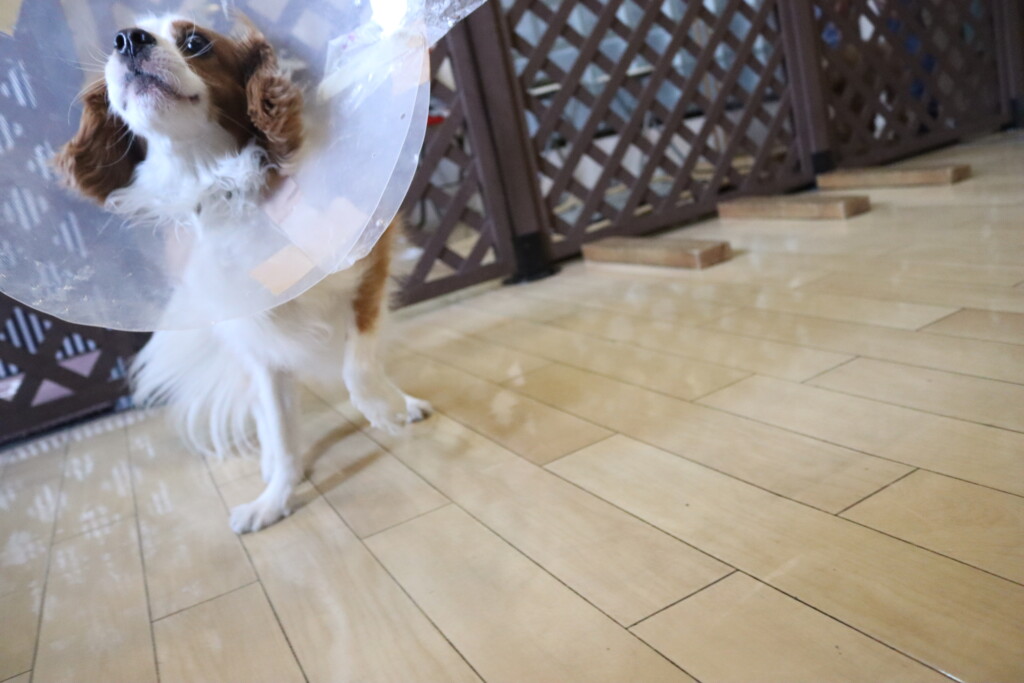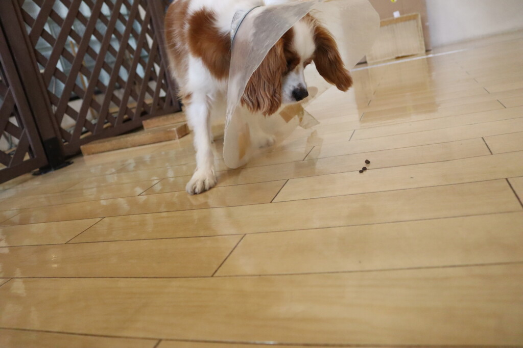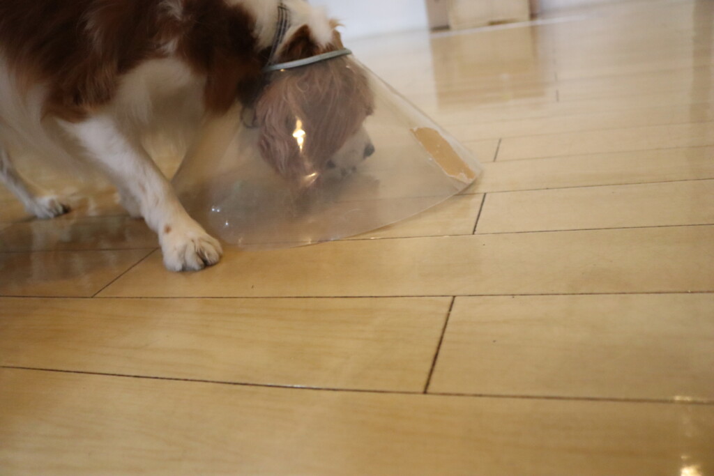 ですが、エリザベスカラーが床に当たるとビックリしたようで思わずこの表情💦