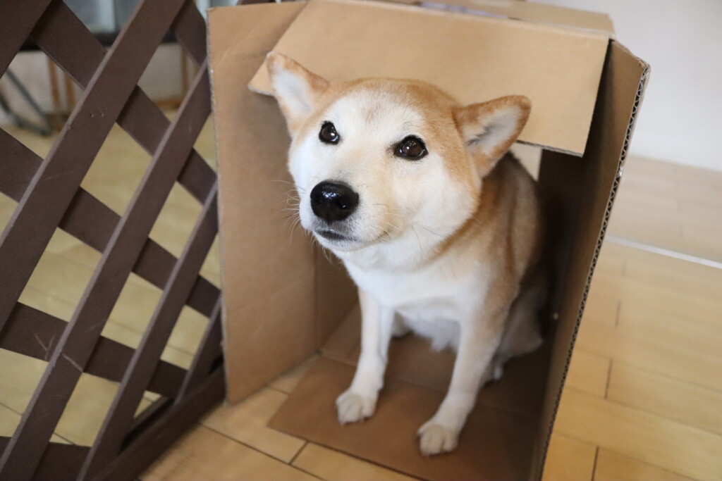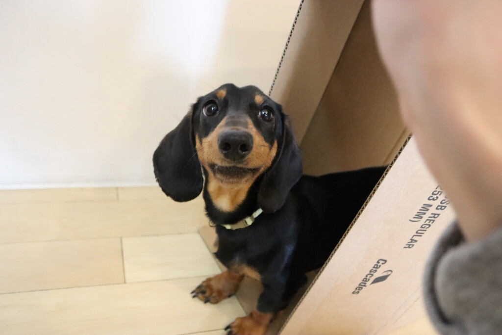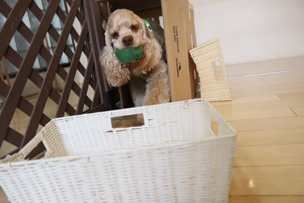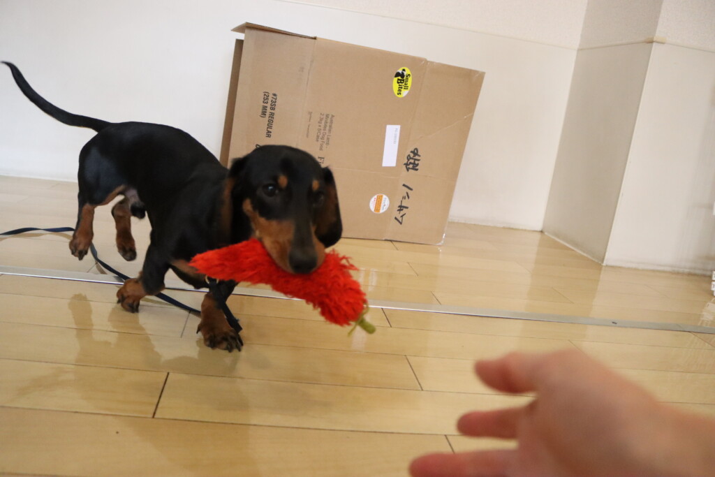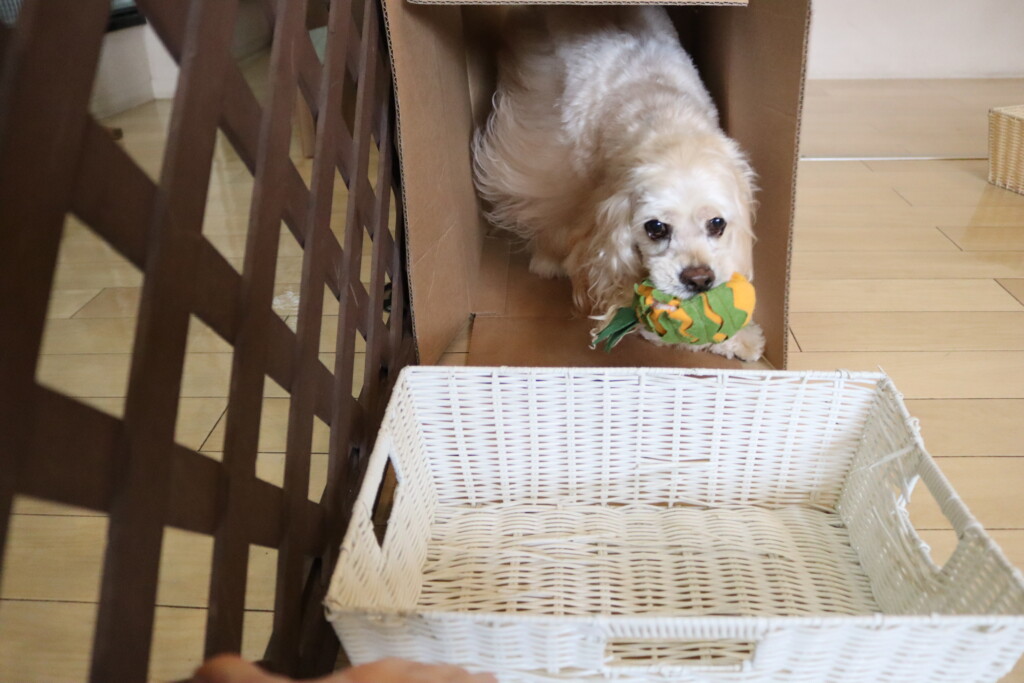 オモチャを咥えたままダンボールの中をくぐり抜け…